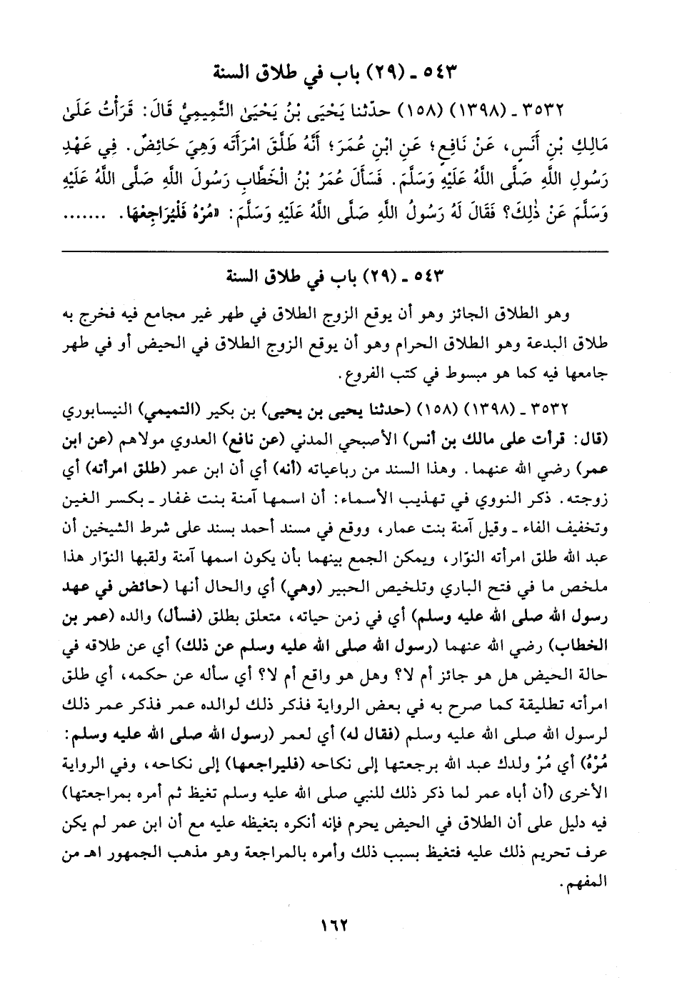 ٣٥٣٢ - (١٣٩٨) (١٥٨) حدثنا يَحْيَى بن يَحيَى التَّمِيمِي قَال: قَرَأْتُ عَلَى مَالِكِ بْنِ أَنَسٍ، عَنْ نَافِعٍ؛ عَنِ ابْنِ عُمَرَ؛ أَنّهُ طَلقَ امرَأَتَه وَهِيَ حَائِض. فِي عَهدِ رَسُولِ اللهِ صَلَى اللهُ عَلَيهِ وَسَلمَ. فَسَأَلَ عُمَرُ بن الْخَطابِ رَسُولَ اللهِ صَلى اللهُ عَلَيهِ وَسَلمَ عَنْ ذلِكَ؟ فَقَال لَهُ رَسُولُ اللهِ صَلى اللهُ عَلَيهِ وَسَلمَ: "مُرهُ فَليُرَاجِعْهَا
