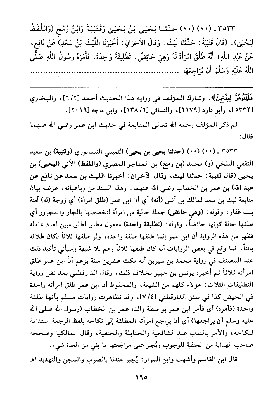 ٣٥٣٣ - (٠٠) (٠٠) حدثنا يَحيَى بن يَحْيَى وَقُتَيبَةُ وَابْنُ رُمحٍ (وَاللفظُ لِيَحْيَى). (قَال قُتَيبَةُ: حَدَّثَنَا لَيثٌ. وَقَال الآخَرَانِ: أَخْبَرَنَا الليثُ بن سَعْدٍ) عَن نَافِع، عَنْ عَبْدِ اللهِ؛ أَنهُ طَلقَ امرَأَةً لَهُ وَهِيَ حَائِضٌ. تَطلِيقَةً وَاحِدَةً. فَأمَرَهُ رَسُولُ اللهِ صَلى اللهُ عَلَيهِ وَسَلمَ أَنْ يُرَاجِعَهَا