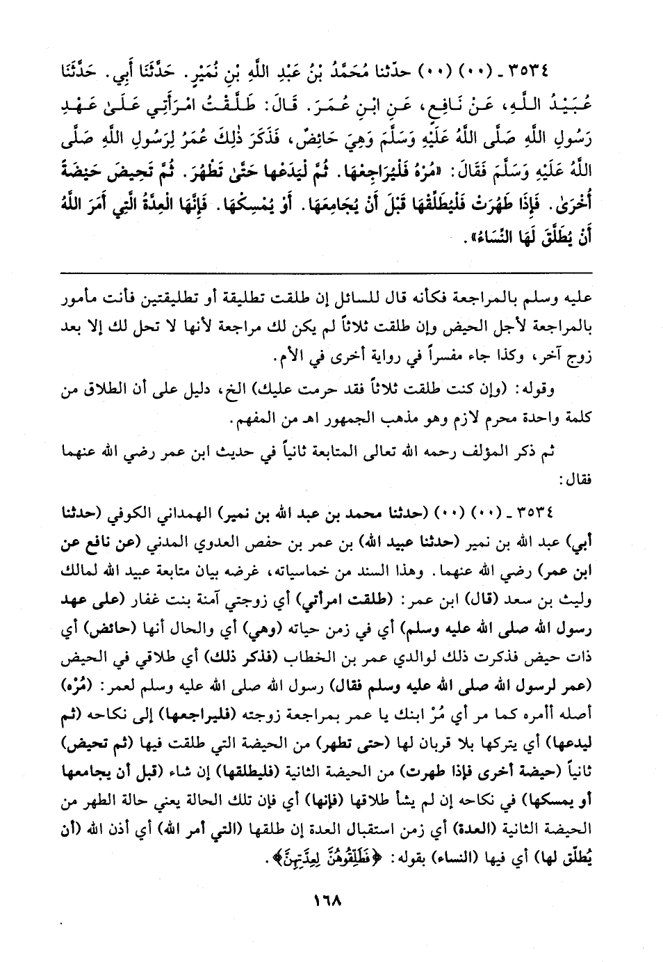 ٣٥٣٤ - (٠٠) (٠٠) (حدثنا محمد بن عبد الله بن نمير) الهمداني الكوفي (حدثنا أبي) عبد الله بن نمير (حدثنا عبيد الله) بن عمر بن حفص العدوي المدني (عن نافع عن ابن عمر) رضي الله عنهما. وهذا السند من خماسياته، غرضه بيان متابعة عبيد الله لمالك وليث بن سعد (قال) ابن عمر: (طلقت امرأتي) أي زوجتي آمنة بنت غفار (على عهد رسول الله صلى الله عليه وسلم) أي في زمن حياته (وهي) أي والحال أنها (حائض) أي ذات حيض فذكرت ذلك لوالدي عمر بن الخطاب (فذكر ذلك) أي طلاقي في الحيض (عمر لرسول الله صلى الله عليه وسلم فقال) رسول الله صلى الله عليه وسلم لعمر: (مُرْه) أصله أأمره كما مر أي مُرْ ابنك يا عمر بمراجعة زوجته (فليراجعها) إلى نكاحه (ثم ليدعها) أي يتركها بلا قربان لها (حتى تطهر) من الحيضة التي طلقت فيها (ثم تحيض) ثانيًا (حيضة أخرى فإذا طهرت) من الحيضة الثانية (فليطلقها) إن شاء (قبل أن يجامعها أو يمسكها) في نكاحه إن لم يشأ طلاقها (فإنها) أي فإن تلك الحالة يعني حالة الطهر من الحيضة الثانية (العدة) أي زمن استقبال العدة إن طلقها (التي أمر الله) أي أذن الله (أن يُطلّق لها) أي فيها (النساء) بقوله: {فَطَلِّقُوهُنَّ لِعِدَّتِهِنَّ}.