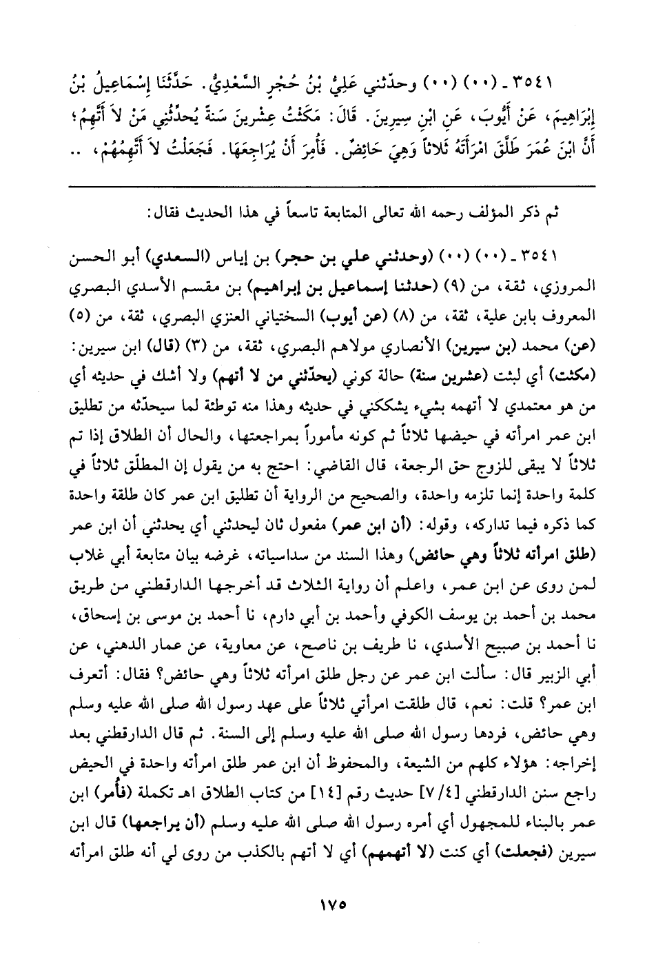 ٣٥٤١ - (٠٠) (٠٠) وحدثني عَلِيُّ بن حُجْرٍ السعدِي. حَدَّثَنَا إِسمَاعِيلُ بْنُ إِبْرَاهِيمَ، عَنْ أيُّوبَ، عَنِ ابنِ سِيرِينَ. قَال: مَكَثْتُ عِشْرينَ سَنةً يُحدِّثُنِي مَن لَا أَتَّهِمُ؛ أَن ابنَ عُمَرَ طَلَّقَ امرَأتَهُ ثَلاثًا وَهِيَ حَائِض. فَأُمِرَ أَنْ يُرَاجِعَهَا. فَجَعَلتُ لا أتهِمُهُم،