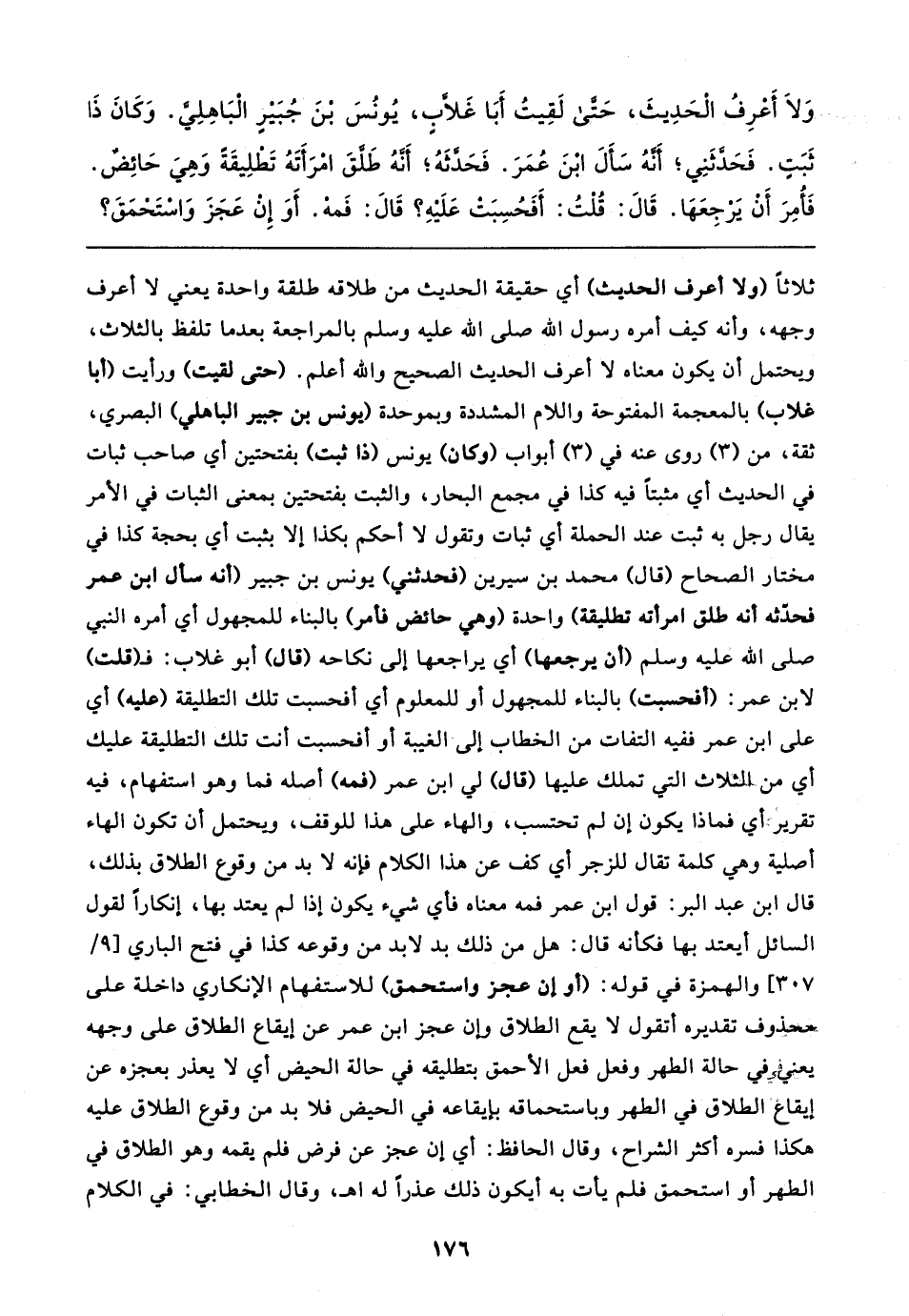 ثلاثًا (ولا أعرف الحديث) أي حقيقة الحديث من طلاقه طلقة واحدة يعني لا أعرف وجهه، وأنه كيف أمره رسول الله صلى الله عليه وسلم بالمراجعة بعدما تلفظ بالثلاث، ويحتمل أن يكون معناه لا أعرف الحديث الصحيح والله أعلم. (حتى لقيت) ورأيت (أبا غلاب) بالمعجمة المفتوحة واللام المشددة وبموحدة (يونس بن جبير الباهلي) البصري، ثقة، من (٣) روى عنه في (٣) أبواب (وكان) يونس (ذا ثبت) بفتحتين أي صاحب ثبات في الحديث أي مثبتًا فيه كذا في مجمع البحار، والثبت بفتحتين بمعنى الثبات في الأمر يقال رجل به ثبت عند الحملة أي ثبات وتقول لا أحكم بكذا إلا بثبت أي بحجة كذا في مختار الصحاح (قال) محمد بن سيرين (فحدثني) يونس بن جبير (أنه سأل ابن عمر فحدّثه أنه طلق امرأته تطليقة) واحدة (وهي حائض فأمر) بالبناء للمجهول أي أمره النبي صلى الله عليه وسلم (أن يرجعها) أي يراجعها إلى نكاحه (قال) أبو غلاب: فـ (قلت) لابن عمر: (أفحسبت) بالبناء للمجهول أو للمعلوم أي أفحسبت تلك التطليقة (عليه) أي على ابن عمر ففيه التفات من الخطاب إلى الغيبة أو أفحسبت أنت تلك التطليقة عليك أي من الثلاث التي تملك عليها (قال) لي ابن عمر (فمه) أصله فما وهو استفهام، فيه تقرير أي فماذا يكون إن لم تحتسب، والهاء على هذا للوقف، ويحتمل أن تكون الهاء أصلية وهي كلمة تقال للزجر أي كف عن هذا الكلام فإنه لا بد من وقوع الطلاق بذلك، قال ابن عبد البر: قول ابن عمر فمه معناه فأي شيء يكون إذا لم يعتد بها، إنكارًا لقول السائل أيعتد بها فكأنه قال: هل من ذلك بد لا بد من وقوعه كذا في فتح الباري [٩/ ٣٠٧] والهمزة في قوله: (أو أن عجز واستحمق) للاستفهام الإنكاري داخلة على محذوف تقديره أتقول لا يقع الطلاق وإن عجز ابن عمر عن إيقاع الطلاق على وجهه يعني في حالة الطهر وفعل فعل الأحمق بتطليقه في حالة الحيض أي لا يعذر بعجزه عن إيقاع الطلاق في الطهر وباستحماقه بإيقاعه في الحيض فلا بد من وقوع الطلاق عليه هكذا فسره أكثر الشراح، وقال الحافظ: أي إن عجز عن فرض فلم يقمه وهو الطلاق في الطهر أو استحمق فلم يأت به أيكون ذلك عذرًا له اهـ، وقال الخطابي: في الكلام