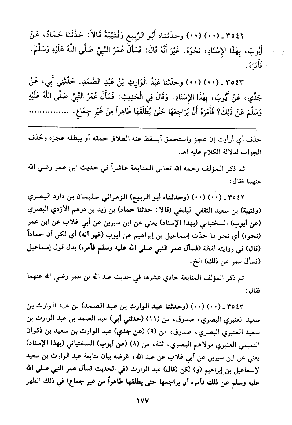 ٣٥٤٣ - (٠٠) (٠٠) (وحدثنا عبد الوارث بن عبد الصمد) بن عبد الوارث بن سعيد العنبري البصري، صدوق، من (١١) (حدثني أبي) عبد الصمد بن عبد الوارث بن سعيد العنبري البصري، صدوق، من (٩) (عن جدي) عبد الوارث بن سعيد بن ذكوان التميمي العنبري مولاهم البصري، ثقة، من (٨) (عن أيوب) السختياني (بهذا الإسناد) يعني عن ابن سيرين عن أبي غلاب عن عبد الله، غرضه بيان متابعة عبد الوارث بن سعيد لإسماعيل بن إبراهيم (و) لكن (قال) عبد الوارث (في الحديث فسأل عمر النبي صلى الله عليه وسلم عن ذلك فأمره أن يراجعها حتى يطلقها طاهرًا من غير جماع) في ذلك الطهر