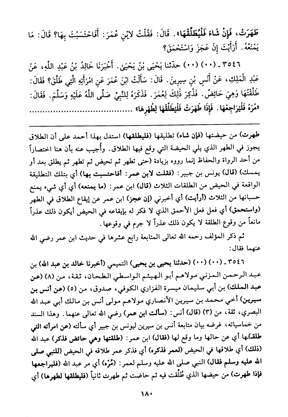 ٣٥٤٦ - (٠٠) (٠٠) (حدثنا يحيى بن يحيى) التميمي (أخبرنا خالد بن عبد الله) بن عبد الرحمن المزني مولاهم أبو الهيثم الواسطي الطحان، ثقة، من (٨) (عن عبد الملك) بن أبي سليمان ميسرة الفزاري الكوفي، صدوق، من (٥) (عن أنس بن سيرين) أخي محمد بن سيرين الأنصاري مولاهم مولى أنس بن مالك أبي عبد الله البصري، ثقة، من (٣) (قال) أنس: (سألت ابن عمر) رضي الله تعالى عنهما. وهذا السند من خماسياته، غرضه بيان متابعة أنس بن سيرين ليونس بن جبير أي سألته (عن امرأته التي طلقـ) ـها أي عن حالها وما وقع لها (فقال) ابن عمر: (طلقتها وهي حائض فدكر) عبد الله (ذلك) أي طلاقها في الحيض (لعمر فذكره) أي فذكر عمر طلاقه في الحيض اللنبي صلى الله عليه وسلم فقال) النبي صلى الله عليه وسلم لعمر: (مُرْه) أي مر عبد الله (فليراجعها فإذا طهرت) من حيضها الذي طُلِّقت فيه ثم حاضت ثم طهرت ثانيًا (فليطلقها لطهرها) أي