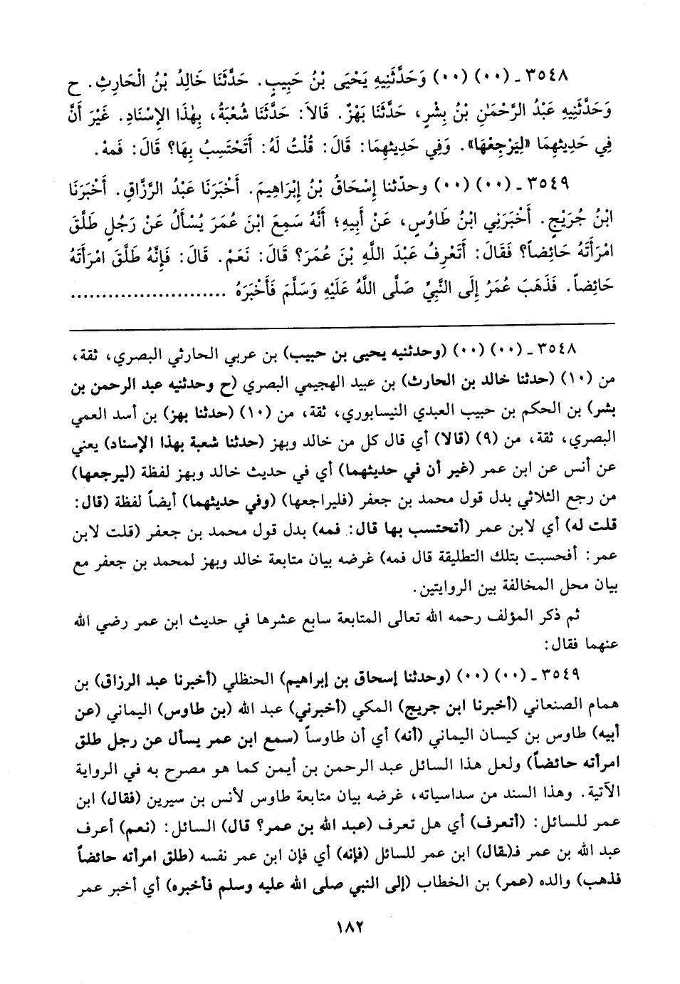 ٣٥٤٩ - (٠٠) (٠٠) (وحدثنا إسحاق بن إبراهيم) الحنظلي (أخبرنا عبد الرزاق) بن همام الصنعاني (أخبرنا ابن جريج) المكي (أخبرني) عبد الله (بن طاوس) اليماني (عن أبيه) طاوس بن كيسان اليماني (أنه) أي أن طاوسًا (سمع ابن عمر يسأل عن رجل طلق امرأته حائضًا) ولعل هذا السائل عبد الرحمن بن أيمن كما هو مصرح به في الرواية الآتية. وهذا السند من سداسياته، غرضه بيان متابعة طاوس لأنس بن سيرين (فقال) ابن عمر للسائل: (أتعرف) أي هل تعرف (عبد الله بن عمر؟ قال) السائل: (نعم) أعرف عبد الله بن عمر فـ (ـقال) ابن عمر للسائل (فإنه) أي فإن ابن عمر نفسه (طلق امرأته حائضًا فذهب) والده (عمر) بن الخطاب (إلى النبي صلى الله عليه وسلم فأخبره) أي أخبر عمر