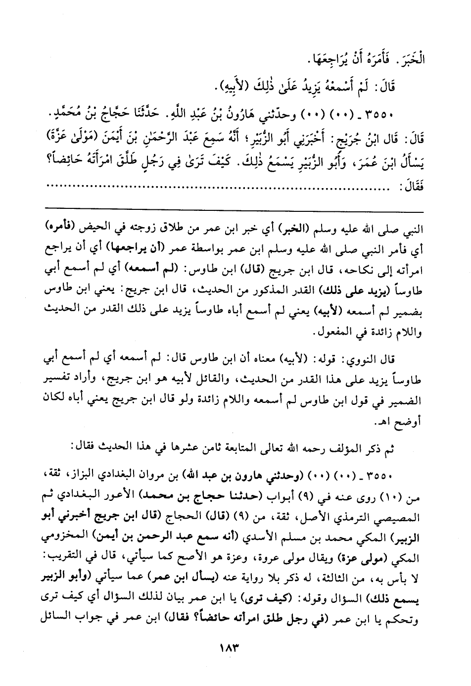٣٥٥٠ - (٠٠) (٠٠) (وحدثني هارون بن عبد الله) بن مروان البغدادي البزاز، ثقة، من (١٠) روى عنه في (٩) أبواب (حدثنا حجاج بن محمد) الأعور البغدادي ثم المصيصي الترمذي الأصل، ثقة، من (٩) (قال) الحجاج (قال ابن جريج أخبرني أبو الزبير) المكي محمد بن مسلم الأسدي (أنه سمع عبد الرحمن بن أيمن) المخزومي المكي (مولى عزة) ويقال مولى عروة، وعزة هو الأصح كما سيأتي، قال في التقريب: لا بأس به، من الثالثة، له ذكر بلا رواية عنه (يسأل ابن عمر) عما سيأتي (وأبو الزبير يسمع ذلك) السؤال وقوله: (كيف ترى) يا ابن عمر بيان لذلك السؤال أي كيف ترى وتحكم يا ابن عمر (في رجل طلق امرأته حائضًا؟ فقال) ابن عمر في جواب السائل