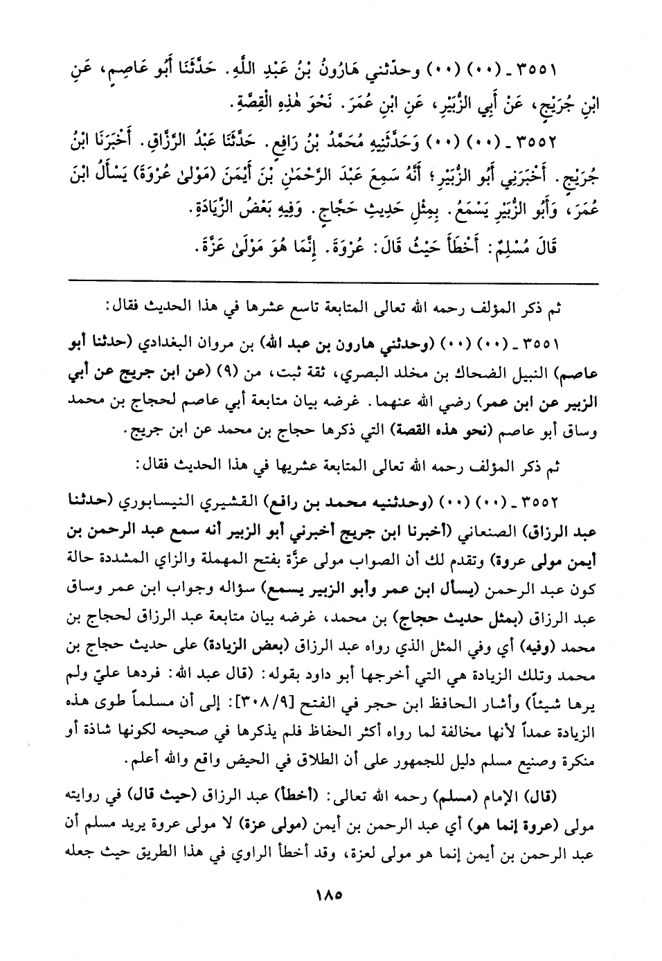 ٣٥٥٢ - (٠٠) (٠٠) (وحدثنيه محمد بن رافع) القشيري النيسابوري (حدثنا عبد الرزاق) الصنعاني (أخبرنا ابن جريج أخبرني أبو الزبير أنه سمع عبد الرحمن بن أيمن مولى عروة) وتقدم لك أن الصواب مولى عزَّة بفتح المهملة والزاي المشددة حالة كون عبد الرحمن (يسأل ابن عمر وأبو الزبير يسمع) سؤاله وجواب ابن عمر وساق عبد الرزاق (بمثل حديث حجاج) بن محمد، غرضه بيان متابعة عبد الرزاق لحجاج بن محمد (وفيه) أي وفي المثل الذي رواه عبد الرزاق (بعض الزيادة) على حديث حجاج بن محمد وتلك الزيادة هي التي أخرجها أبو داود بقوله: (قال عبد الله: فردها على ولم يرها شيئًا) وأشار الحافظ ابن حجر في الفتح [٩/ ٣٠٨]: إلى أن مسلمًا طوى هذه الزيادة عمدًا لأنها مخالفة لما رواه أكثر الحفاظ فلم يذكرها في صحيحه لكونها شاذة أو منكرة وصنيع مسلم دليل للجمهور على أن الطلاق في الحيض واقع والله أعلم.