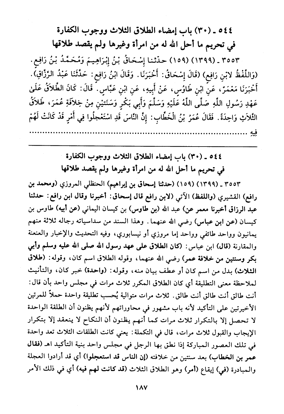 ٣٥٥٣ - (١٣٩٩) (١٥٩) حدَّثنا إِسْحَاقُ بْنُ إِبْرَاهِيمَ وَمُحَمَّدُ بْنُ رَافِعٍ. (وَاللَّفْظُ لابْنِ رَافِعٍ) (قَال إِسْحَاقُ: أَخبَرَنَا. وَقَال ابْنُ رَافِعٍ: حَدَّثَنَا عَبدُ الرَّزَّاقِ). أَخْبَرَنَا مَعْمَرٌ، عَنِ ابْنِ طَاوُسٍ، عَنْ أَبيهِ، عَنِ ابْنِ عَبَّاسٍ. قَال: كَانَ الطَّلاقُ عَلَى عَهْدِ رَسُولِ اللهِ صَلَّى اللهُ عَلَيهِ وَسَلَّمَ وَأَبِي بَكرٍ وَسَنَتينِ مِنْ خِلافَةِ عُمَرَ، طَلاقُ الثَّلاثِ وَاحِدَةً. فَقَال عُمَرُ بْنُ الْخَطَّابِ: إِنَّ النَّاسَ قَدِ اسْتَعْجلُوا فِي أَمْرٍ قَدْ كَانَت لَهُمْ فِيهِ