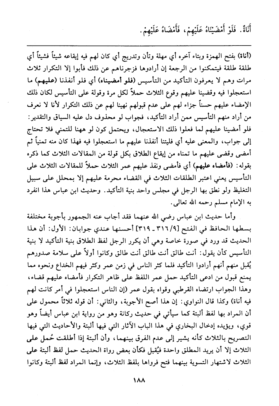 (أناة) بفتح الهمزة وبتاء آخره أي مهلة وتأن وتدريج أي كان لهم فيه إيقاعه شيئًا فشيئًا أي طلقة طلقة فيتمكنوا من الرجعة إن أرادوها فزجرناهم عن ذلك فأبوا إلا التكرار ثلاث مرات وهم لا يعرفون التأكيد من التأسيس (فلو أمضيناه) أي فلو أنفذنا (عليهم) ما استعجلوا فيه وقضينا عليهم وقوع الثلاث حملًا لكل مرة وقولة على التأسيس لكان ذلك الإمضاء عليهم حسنًا جزاء لهم على عدم قبولهم نهينا لهم عن ذلك التكرار لأنا لا نعرف من أراد منهم التأسيس ممن أراد التأكيد، فجواب لو محذوف دل عليه السياق والتقدير: فلو أمضينا عليهم لما فعلوا ذلك الاستعجال، ويحتمل كون لو ها هنا للتمني فلا تحتاج إلى جواب، والمعنى عليه أي فليتنا أنفذنا عليهم ما استعجلوا فيه فهذا كان منه تمنيًا ثم أمضى وقضى عليهم ما تمناه من إيقاع الطلاق بكل قولة من المقالات الثلاث كما ذكره بقوله: (فأمضاه عليهم) أي فأمضى ونفذ عليهم عمر الثلاث حملًا للمقالات الثلاث على التأسيس يعني اعتبر الطلقات الثلاث في القضاء محرمة عليهم إلا بمحلل على سبيل التغليظ ولو نطق بها الرجل في مجلس واحد بنية التأكيد. وحديث ابن عباس هذا انفرد به الإمام مسلم رحمه الله تعالى.