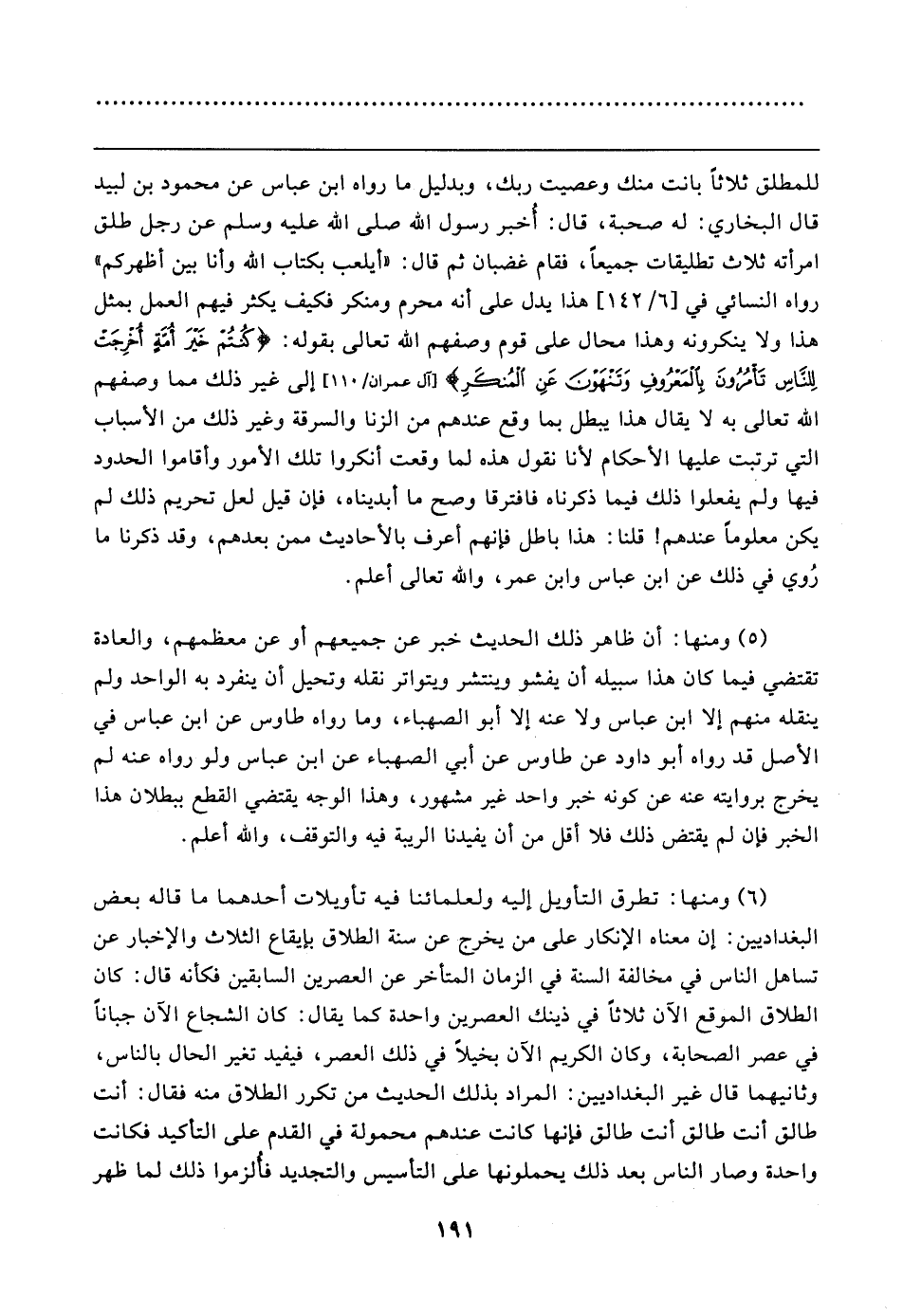 للمطلق ثلاثًا بانت منك وعصيت ربك، وبدليل ما رواه ابن عباس عن محمود بن لبيد قال البخاري: له صحبة، قال: أخبر رسول الله صلى الله عليه وسلم عن رجل طلق امرأته ثلاث تطليقات جميعًا، فقام غضبان ثم قال: "أيلعب بكتاب الله وأنا بين أظهركم" رواه النسائي في [٦/ ١٤٢] هذا يدل على أنه محرم ومنكر فكيف يكثر فيهم العمل بمثل هذا ولا ينكرونه وهذا محال على قوم وصفهم الله تعالى بقوله: {كُنْتُمْ خَيرَ أُمَّةٍ أُخْرِجَتْ لِلنَّاسِ تَأْمُرُونَ بِالْمَعْرُوفِ وَتَنْهَوْنَ عَنِ الْمُنْكَرِ} [آل عمران: ١١٠] إلى غير ذلك مما وصفهم الله تعالى به لا يقال هذا يبطل بما وقع عندهم من الزنا والسرقة وغير ذلك من الأسباب التي ترتبت عليها الأحكام لأنا نقول هذه لما وقعت أنكروا تلك الأمور وأقاموا الحدود فيها ولم يفعلوا ذلك فيما ذكرناه فافترقا وصح ما أبديناه، فإن قيل لعل تحريم ذلك لم يكن معلومًا عندهم! قلنا: هذا باطل فإنهم أعرف بالأحاديث ممن بعدهم، وقد ذكرنا ما رُوي في ذلك عن ابن عباس وابن عمر، والله تعالى أعلم.