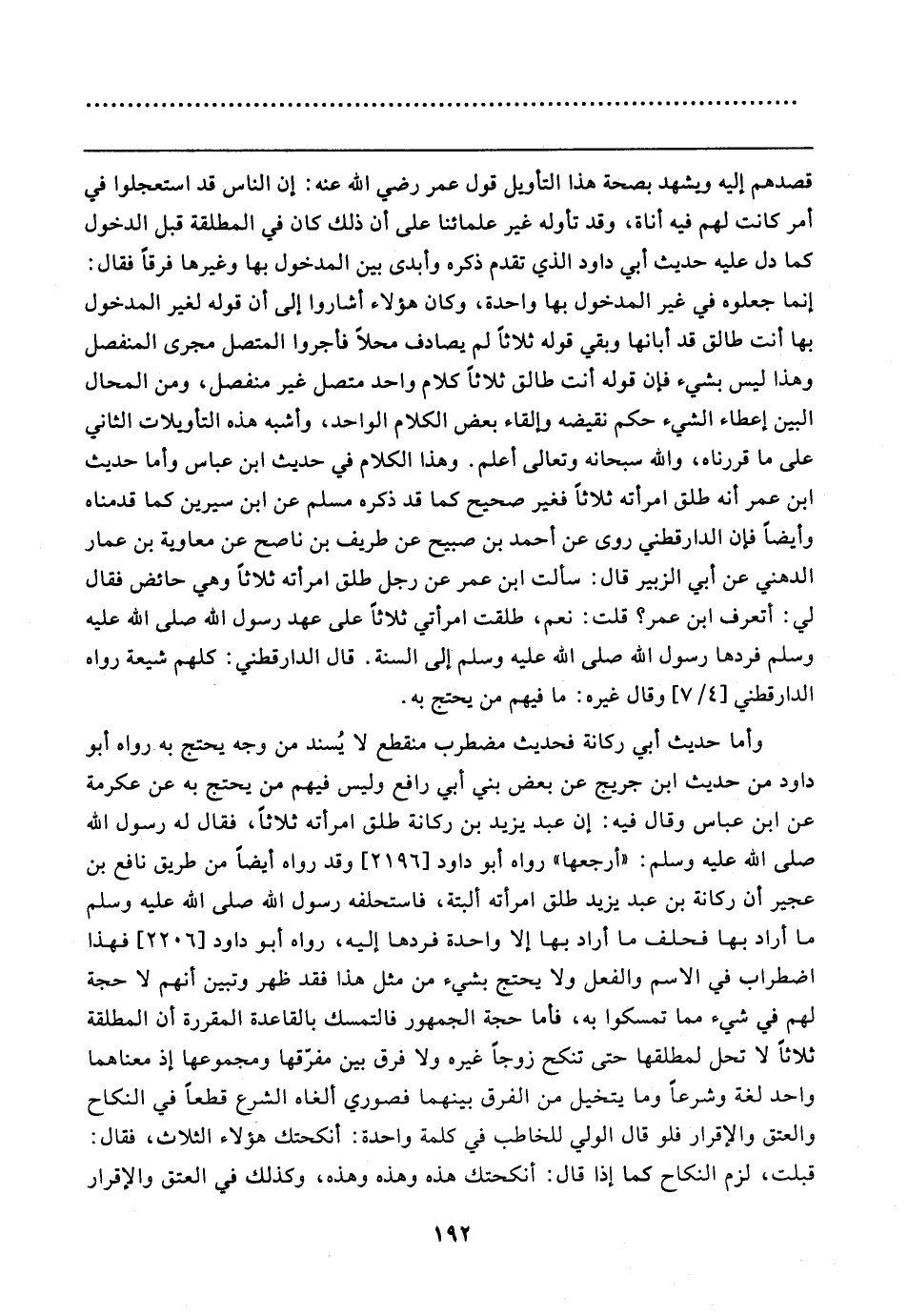 وأما حديث أبي ركانة فحديث مضطرب منقطع لا يُسند من وجه يحتج به رواه أبو داود من حديث ابن جريج عن بعض بني أبي رافع وليس فيهم من يحتج به عن عكرمة عن ابن عباس وقال فيه: إن عبد يزيد بن ركانة طلق امرأته ثلاثًا، فقال له رسول الله صلى الله عليه وسلم: "أرجعها" رواه أبو داود [٢١٩٦] وقد رواه أيضًا من طريق نافع بن عجير أن ركانة بن عبد يزيد طلق امرأته ألبتة، فاستحلفه رسول الله صلى الله عليه وسلم ما أراد بها فحلف ما أراد بها إلا واحدة فردها إليه، رواه أبو داود [٢٢٠٦] فهذا اضطراب في الاسم والفعل ولا يحتج بشيء من مثل هذا فقد ظهر وتبين أنهم لا حجة لهم في شيء مما تمسكوا به، فأما حجة الجمهور فالتمسك بالقاعدة المقررة أن المطلقة ثلاثًا لا تحل لمطلقها حتى تنكح زوجا غيره ولا فرق بين مفرّقها ومجموعها إذ معناهما واحد لغة وشرعًا وما يتخيل من الفرق بينهما فصوري ألغاه الشرع قطعًا في النكاح والعتق والإقرار فلو قال الولي للخاطب في كلمة واحدة: أنكحتك هؤلاء الثلاث، فقال: قبلت، لزم النكاح كما إذا قال: أنكحتك هذه وهذه وهذه، وكذلك في العتق والإقرار