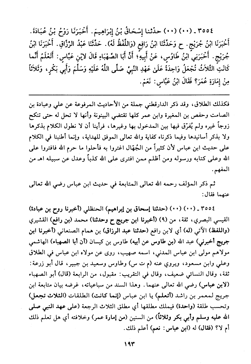 ٣٥٥٤ - (٠٠) (٠٠) حدَّثنا إِسْحَاقُ بْنُ إِبْرَاهِيمَ. أَخبَرَنَا رَوْحُ بْنُ عُبَادَةَ. أَخبَرَنَا ابْنُ جُرَيجٍ. ح وَحَدَّثَنَا ابْنُ رَافِعٍ (وَاللَّفْظُ لَهُ). حَدَّثَنَا عَبْدُ الرَّزَّاقِ. أَخبَرَنَا ابْنُ جُرَيج. أخبَرَنِي ابْنُ طَاوُسٍ، عَنْ أَبِيهِ؛ أَن أَبَا الصَّهْبَاءِ قَال لابْنِ عَبَّاسٍ: أَتَعْلَمُ أَنَّما كَانَتِ الثَّلاثُ تُجْعَلُ وَاحِدَةً عَلَى عَهْدِ النَّبِيِّ صَلَّى اللهُ عَلَيهِ وَسَلَّمَ وَأَبِي بَكرٍ، وَثَلاثًا مِنْ إِمَارَةِ عُمَرَ؟ فقال ابْنُ عَبَّاسٍ: نَعَمْ