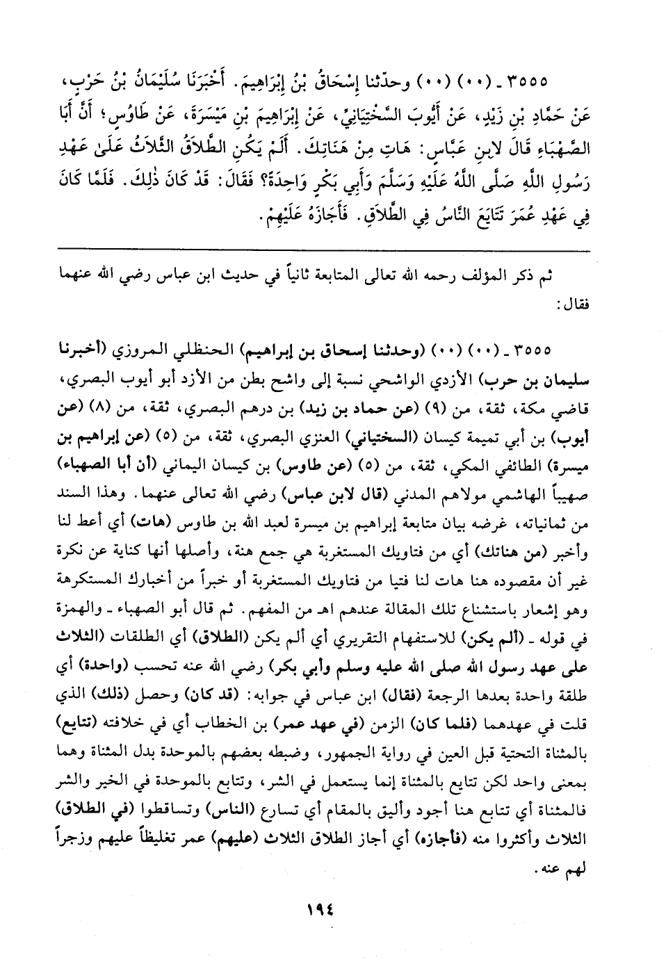 ٣٥٥٥ - (٠٠) (٠٠) وحدّثنا إِسْحَاقُ بْنُ إِبْرَاهِيمَ. أَخبَرَنَا سُلَيمَانُ بْنُ حَرْبٍ، عَنْ حَمَّادِ بْنِ زَيدٍ، عَنْ أَيُّوبَ السَّخْتِيَانِيِّ، عَنْ إِبْرَاهِيمَ بْنِ مَيسَرَةَ، عَنْ طَاوُسٍ؛ أَنَّ أَبَا الصَّهْبَاءِ قَال لابنِ عَبَّاسٍ: هَاتِ مِنْ هَنَاتِكَ. أَلَمْ يَكُنِ الطَّلاقُ الثَّلاثُ عَلَى عَهْدِ رَسُولِ اللهِ صَلَّى اللهُ عَلَيهِ وَسَلَّمَ وَأَبِي بَكرٍ وَاحِدَةً؟ فَقَال: قَدْ كَانَ ذلِكَ. فَلَمَّا كَانَ فِي عَهْدِ عُمَرَ تَتَايَعَ النَّاسُ فِي الطلاقِ. فَأَجَازَهُ عَلَيهِمْ