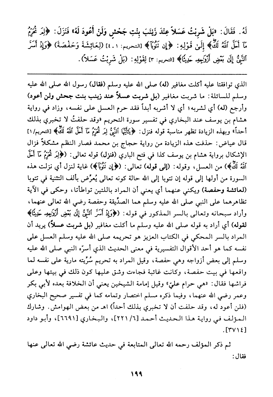 لَهُ. فَقَال: "بَلْ شَرِبْتُ عَسَلًا عِنْدَ زَينَبَ بِنْتِ جَحْشٍ وَلَنْ أَعُودَ لَهُ" فَنَزَلَ: {لِمَ تُحَرِّمُ مَا أَحَلَّ اللَّهُ لَكَ} إِلَى قَوْلِهِ: {إِنْ تَتُوبَا} [التحريم: ١ - ٤] (لِعَائِشَةَ وَحَفْصَةَ) {وَإِذْ أَسَرَّ النَّبِيُّ إِلَى بَعْضِ أَزْوَاجِهِ حَدِيثًا} [التحريم: ٣] لِقَوْلِهِ: (بَلْ شَرِبْتُ عَسَلًا)