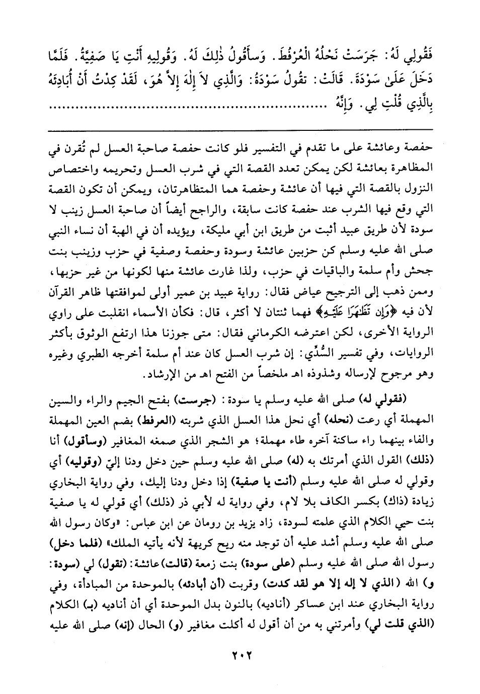 حفصة وعائشة على ما تقدم في التفسير فلو كانت حفصة صاحبة العسل لم تُقرن في المظاهرة بعائشة لكن يمكن تعدد القصة التي في شرب العسل وتحريمه واختصاص النزول بالقصة التي فيها أن عائشة وحفصة هما المتظاهرتان، ويمكن أن تكون القصة التي وقع فيها الشرب عند حفصة كانت سابقة، والراجح أيضًا أن صاحبة العسل زينب لا سودة لأن طريق عبيد أثبت من طريق ابن أبي مليكة، ويؤيده أن في الهبة أن نساء النبي صلى الله عليه وسلم كن حزبين عائشة وسودة وحفصة وصفية في حزب وزينب بنت جحش وأم سلمة والباقيات في حزب، ولذا غارت عائشة منها لكونها من غير حزبها، وممن ذهب إلى الترجيح عياض فقال: رواية عبيد بن عمير أولى لموافقتها ظاهر القرآن لأن فيه {وَإِنْ تَظَاهَرَا عَلَيهِ} فهما ثنتان لا أكثر، قال: فكان الأسماء انقلبت على راوي الرواية الأخرى، لكن اعترضه الكرماني فقال: متى جوزنا هذا ارتفع الوثوق بأكثر الروايات، وفي تفسير السُّدِّي: إن شرب العسل كان عند أم سلمة أخرجه الطبري وغيره وهو مرجوح لإرساله وشذوذه اهـ ملخصًا من الفتح اهـ من الإرشاد.