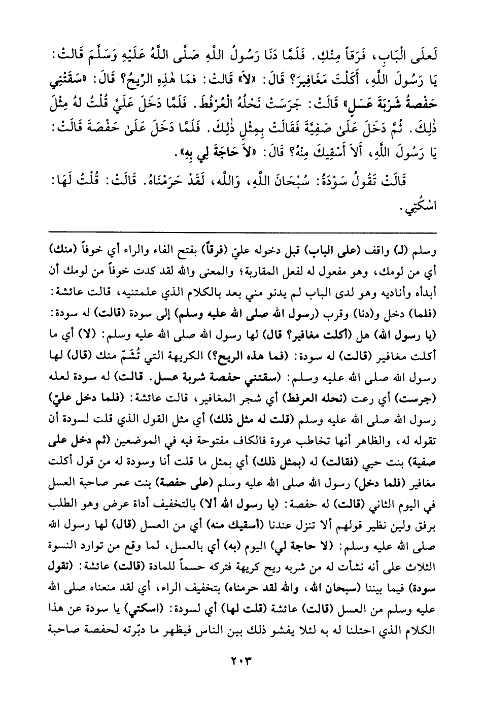 وسلم (لـ) واقف (على الباب) قبل دخوله علي (فرقًا) بفتح الفاء والراء أي خوفًا (منك) أي من لومك، وهو مفعول له لفعل المقاربة؛ والمعنى والله لقد كدت خوفًا من لومك أن أبدأه وأناديه وهو لدى الباب لم يدنو مني بعد بالكلام الذي علمتنيه، قالت عائشة: (فلما) دخل و (دنا) وقرب (رسول الله صلى الله عليه وسلم) إلى سودة (قالت) له سودة: (يا رسول الله) هل (أكلت مغافير؟ قال) لها رسول الله صلى الله عليه وسلم: (لا) أي ما أكلت مغافير (قالت) له سودة: (فما هذه الريح؟ ) الكريهة التي تُشَمّ منك (قال) لها رسول الله صلى الله عليه وسلم: (سقتني حفصة شربة عسل. قالت) له سودة لعله (جرست) أي رعت (نحله العرفط) أي شجر المغافير، قالت عائشة: (فلما دخل عليّ) رسول الله صلى الله عليه وسلم (قلت له مثل ذلك) أي مثل القول الذي قلت لسودة أن تقوله له، والظاهر أنها تخاطب عروة فالكاف مفتوحة فيه في الموضعين (ثم دخل على صفية) بنت حيي (فقالت) له (بمثل ذلك) أي بمثل ما قلت أنا وصودة له من قول أكلت مغافير (فلما دخل) رسول الله صلى الله عليه وسلم (على حفصة) بنت عمر صاحبة العسل في اليوم الثاني (قالت) له حفصة: (يا رسول الله ألا) بالتخفيف أداة عرض وهو الطلب برفق ولين نظير قولهم ألا تنزل عندنا (أسقيك منه) أي من العسل (قال) لها رسول الله صلى الله عليه وسلم: (لا حاجة لي) اليوم (به) أي بالعسل، لما وقع من توارد النسوة الثلاث على أنه نشأت له من شربه ريح كريهة فتركه حسمًا للمادة (قالت) عائشة: (تقول سودة) فيما بيننا (سبحان الله، والله لقد حرمناه) بتخفيف الراء، أي لقد منعناه صلى الله عليه وسلم من العسل (قالت) عائشة (قلت لها) أي لسودة: (اسكتي) يا سودة عن هذا الكلام الذي احتلنا له به لئلا يفشو ذلك بين الناس فيظهر ما دبّرته لحفصة صاحبة
