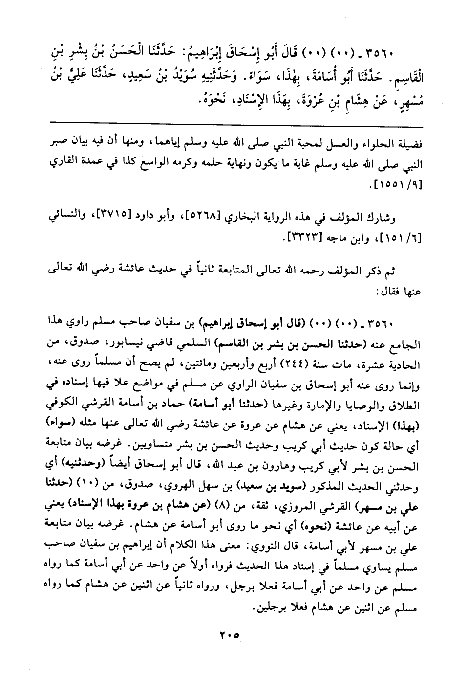 ٣٥٦٠ - (٠٠) (٠٠) (قال أبو إسحاق إبراهيم) بن سفيان صاحب مسلم راوي هذا الجامع عنه (حدثنا الحسن بن بشر بن القاسم) السلمي قاضي نيسابور، صدوق، من الحادية عشرة، مات سنة (٢٤٤) أربع وأربعين ومائتين، لم يصح أن مسلمًا روى عنه، وإنما روى عنه أبو إسحاق بن سفيان الراوي عن مسلم في مواضع علا فيها إسناده في الطلاق والوصايا والإمارة وغيرها (حدثنا أبو أسامة) حماد بن أسامة القرشي الكوفي (بهذا) الإسناد، يعني عن هشام عن عروة عن عائشة رضي الله تعالى عنها مثله (سواء) أي حالة كون حديث أبي كريب وحديث الحسن بن بثر متساويين. غرضه بيان متابعة الحسن بن بشر لأبي كريب وهارون بن عبد الله، قال أبو إسحاق أيضًا (وحدثنيه) أي وحدثني الحديث المذكور (سويد بن سيد) بن سهل الهروي، صدوق، من (١٠) (حدثنا علي بن مسهر) القرشي المروزي، ثقة، من (٨) (عن هشام بن عروة بهذا الإسناد) يعني عن أبيه عن عائشة (نحوه) أي نحو ما روى أبو أسامة عن هشام. غرضه بيان متابعة علي بن مسهر لأبي أسامة، قال النووي: معنى هذا الكلام أن إبراهيم بن سفيان صاحب مسلم يساوي مسلمًا في إسناد هذا الحديث فرواه أولًا عن واحد عن أبي أسامة كما رواه مسلم عن واحد عن أبي أسامة فعلا برجل، ورواه ثانيًا عن اثنين عن هشام كما رواه مسلم عن اثنين عن هشام فعلا برجلين.