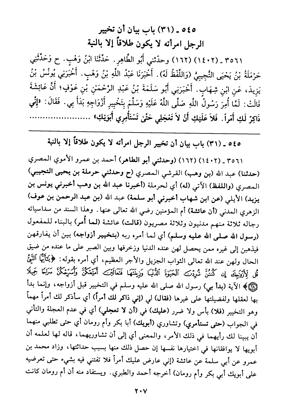٣٥٦١ - (١٤٠٢) (١٦٢) (وحدثني أبو الطاهر) أحمد بن عمرو الأموي المصري (حدثنا) عبد الله (بن وهب) القرشي المصري (ح وحدثني حرملة بن يحيى التجيبي) المصري (واللفظ) الآتي (له) أي لحرملة (أخبرنا عبد الله بن وهب أخبرني يونس بن يزيد) الأيلي (عن ابن شهاب أخبرني أبو سلمة) عبد الله (بن عبد الرحمن بن عوف) الزهري المدني (أن عائشة) أم المؤمنين رضي الله تعالى عنها. وهذا السند من سداسياته رجاله ثلاثة منهم مدنيون وثلاثة مصريون (قالت) عائشة (لما أُمر) بالبناء للمفعول (رسول الله صلى الله عليه وسلم) أي لما أمره ربه (بتخيير أزواجه) بين أن يفارقهن فيذهبن إلى غيره ممن يحصل لهن عنده الدنيا وزخرفها وبين الصبر على ما عنده من ضيق الحال ولهن عند الله تعالى الثواب الجزيل والأجر العظيم، أي أمره بقوله: {يَا أَيُّهَا النَّبِيُّ قُلْ لِأَزْوَاجِكَ إِنْ كُنْتُنَّ تُرِدْنَ الْحَيَاةَ الدُّنْيَا وَزِينَتَهَا فَتَعَالينَ أُمَتِّعْكُنَّ وَأُسَرِّحْكُنَّ سَرَاحًا جَمِيلًا (٢٨)} الآية (بدأ بي) رسول الله صلى الله عليه وسلم في التخيير قبل أزواجه، وإنما بدأ بها لعقلها ولفضيلتها على غيرها (فقال) لي (إني ذاكر لك أمرًا) أي سأذكر لك أمرًا مهمًا وهو التخيير (فلا) بأس ولا ضرر (عليك) في (أن لا تعجلي) أي في عدم العجلة والتأني في الجواب (حتى تستأمري) وتشاوري (أبويك) أبا بكر وأم رومان أي حتى تطلبي منهما أن يبينا لك رأيهما في ذلك الأمر، والمعنى أي إلى أن تشاوريهما، قاله لها لعلمه أن أبويها لا يوافقانها في اختيارها نفسها إن حصل ذلك منها بسبب حداثتها، وزاد محمد بن عمرو عن أبي سلمة عن عائشة (إني عارض عليك أمرًا فلا تفتني فيه بشيء حتى تعرضيه على أبويك أبي بكر وأم رومان) أخرجه أحمد والطبري. ويستفاد منه أن أم رومان كانت