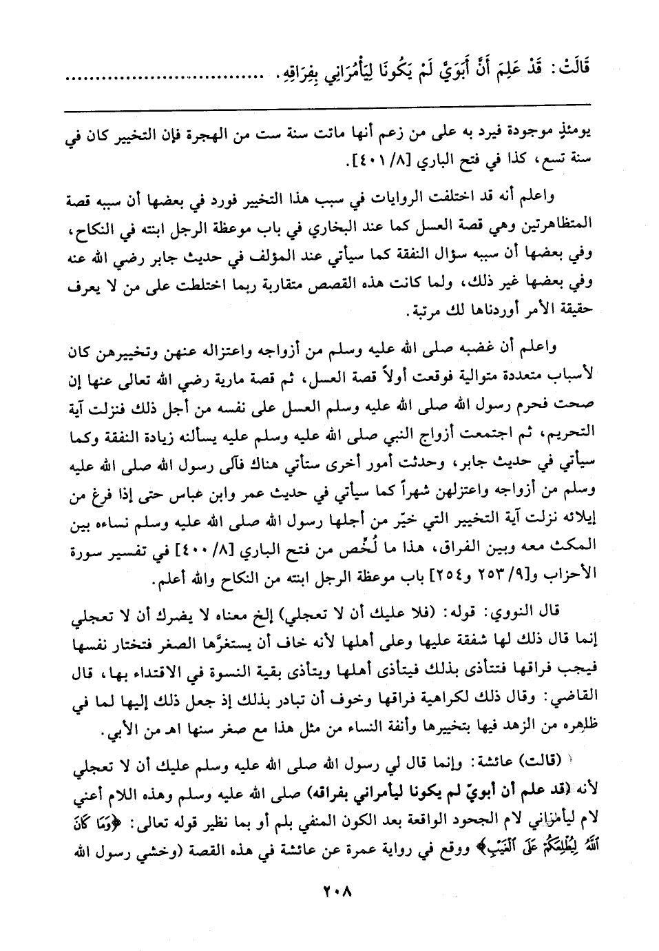 واعلم أن غضبه صلى الله عليه وسلم من أزواجه واعتزاله عنهن وتخييرهن كان لأسباب متعددة متوالية فوقعت أولًا قصة العسل، ثم قصة مارية رضي الله تعالى عنها إن صحت فحرم رسول الله صلى الله عليه وسلم العسل على نفسه من أجل ذلك فنزلت آية التحريم، ثم اجتمعت أزواج النبي صلى الله عليه وسلم عليه يسألنه زيادة النفقة وكلما سيأتي في حديث جابر، وحدثت أمور أخرى ستأتي هناك فآلى رسول الله صلى الله عليه وسلم من أزواجه واعتزلهن شهرًا كما سيأتي في حديث عمر وابن عباس حتى إذا فرغ من إيلائه نزلت آية التخيير التي خيّر من أجلها رسول الله صلى الله عليه وسلم نساءه بين المكث معه وبين الفراق، هذا ما لُخِّص من فتح الباري [٨/ ٤٠٠]، في تفسير سورة الأحزاب و [٩/ ٢٥٣ و ٢٥٤]، باب موعظة الرجل ابنته من النكاح والله أعلم.