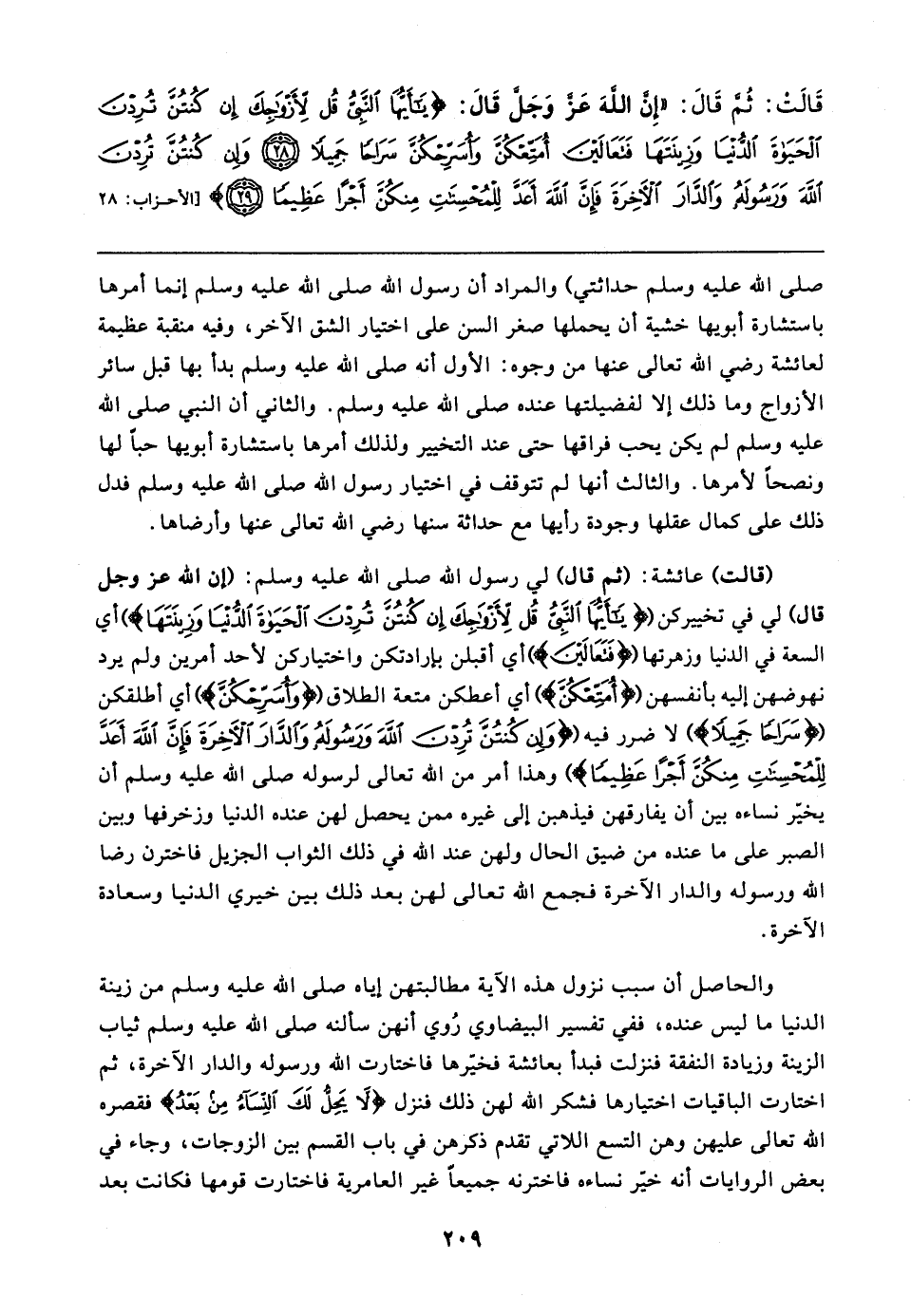 قَالتْ: ثُمَّ قَال: "إِنَّ اللهَ عَزَّ وَجَلَّ قَال: {يَا أَيُّهَا النَّبِيُّ قُلْ لِأَزْوَاجِكَ إِنْ كُنْتُنَّ تُرِدْنَ الْحَيَاةَ الدُّنْيَا وَزِينَتَهَا فَتَعَالينَ أُمَتِّعْكُنَّ وَأُسَرِّحْكُنَّ سَرَاحًا جَمِيلًا (٢٨) وَإِنْ كُنْتُنَّ تُرِدْنَ اللَّهَ وَرَسُولَهُ وَالدَّارَ الْآخِرَةَ فَإِنَّ اللَّهَ أَعَدَّ لِلْمُحْسِنَاتِ مِنْكُنَّ أَجْرًا عَظِيمًا (٢٩)} [الأحزاب: ٢٨
