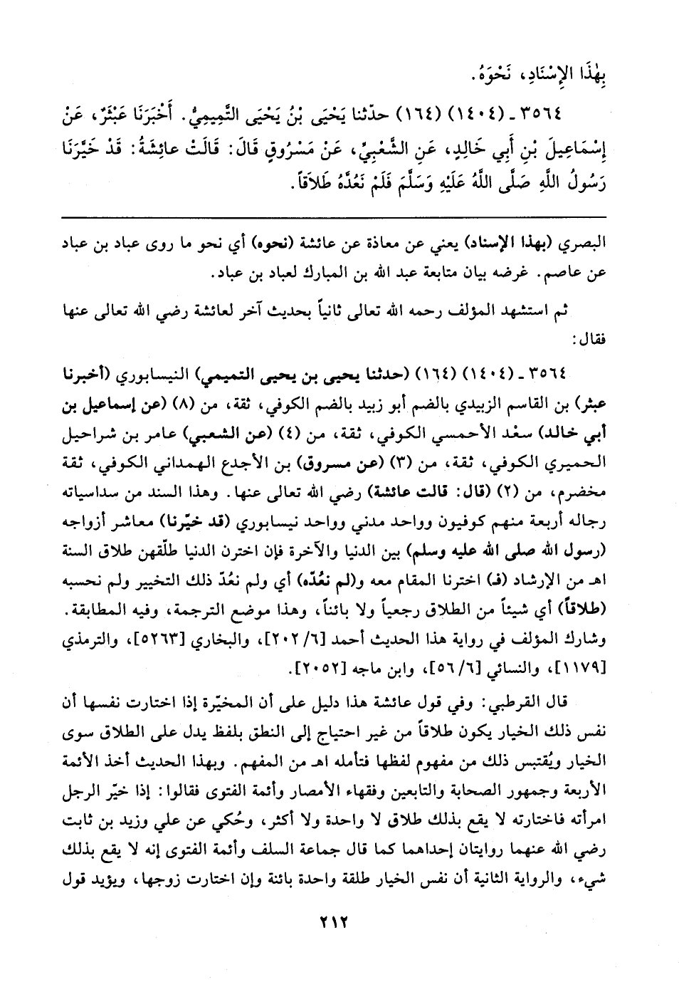 ٣٥٦٤ - (١٤٠٤) (١٦٤) حدَّثنا يَحْيَى بْنُ يَحْيَى التَّمِيمِيُّ. أَخْبَرَنَا عَبْثَرٌ، عَنْ إِسْمَاعِيلَ بْنِ أَبِي خَالِدٍ، عَنِ الشَّعْبِيِّ، عَنْ مَسْرُوقٍ قَال: قَالث عائِشَةُ: قَدْ خَيَّرَنَا رَسُولُ اللهِ صَلَّى اللهُ عَلَيهِ وَسَلَّمَ فَلَم نَعُدَّهُ طَلاقًا