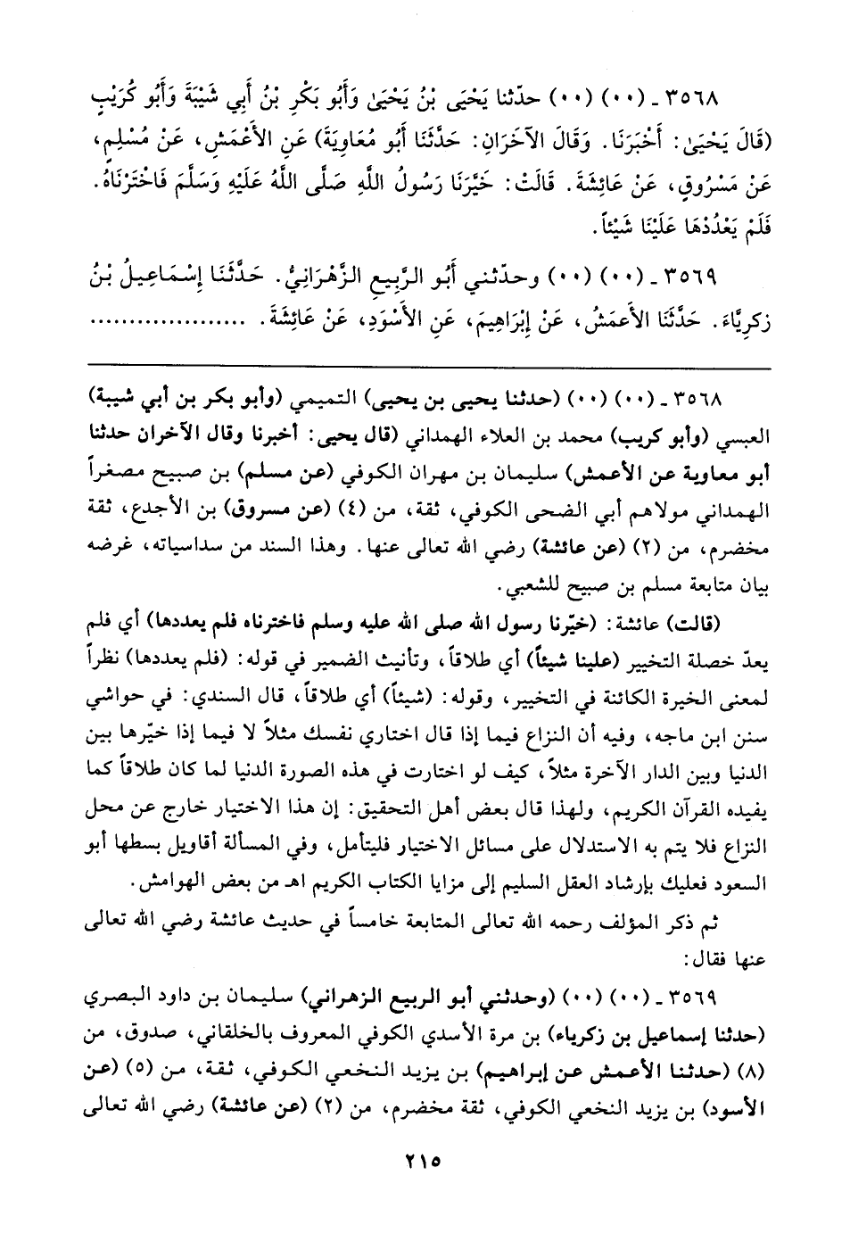 ٣٥٦٨ - (٠٠) (٠٠) (حدثنا يحيى بن يحيى) التميمي (وأبو بكر بن أبي شيبة) العبسي (وأبو كريب) محمد بن العلاء الهمداني (قال يحيى: أخبرنا وقال الآخران حدثنا أبو معاوية عن الأعمش) سليمان بن مهران الكوفي (عن مسلم) بن صبيح مصغرًا الهمداني مولاهم أبي الضحى الكوفي، ثقة، من (٤) (عن مسروق) بن الأجدع، ثقة مخضرم، من (٢) (عن عائشة) رضي الله تعالى عنها. وهذا السند من سداسياته، غرضه بيان متابعة مسلم بن صبيح للشعبي.