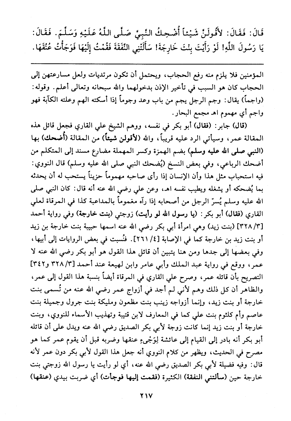 قَال: فَقَال: لأَقُولَنَّ شَيئًا أُضْحِكُ النَّبِيَّ صَلَّى اللهُ عَلَيهِ وَسَلَّمَ. فَقَال: يَا رَسُولَ اللهِ! لَوْ رَأَيتَ بِنْتَ خَارِجَةَ! سَأَلَتْنِي النَّفَقَةَ فَقُمْتُ إِلَيهَا فَوَجَأتُ عُنُقَهَا