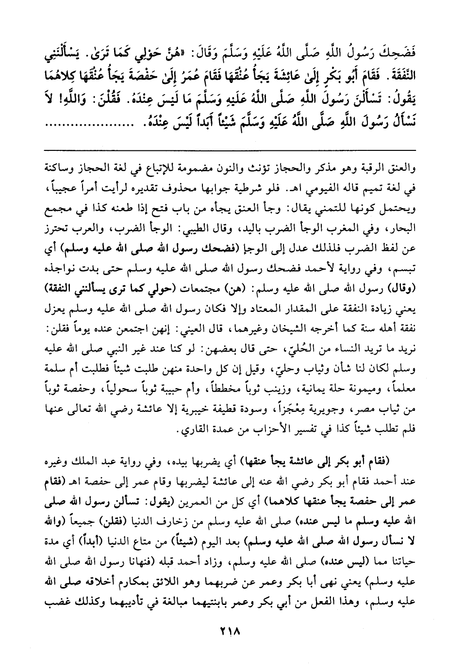 والعنق الرقبة وهو مذكر والحجاز تؤنث والنون مضمومة للإتباع في لغة الحجاز وساكنة في لغة تميم قاله الفيومي اهـ. فلو شرطية جوابها محذوف تقديره لرأيت أمرًا عجيبًا، ويحتمل كونها للتمني يقال: وجأ العنق يجأه من باب فتح إذا طعنه كذا في مجمع البحار، وفي المغرب الوجأ الضرب باليد، وقال الطيبي: الوجأ الضرب، والعرب تحترز عن لفظ الضرب فلذلك عدل إلى الوجإ (فضحك رسول الله صلى الله عليه وسلم) أي تبسم، وفي رواية لأحمد فضحك رسول الله صلى الله عليه وسلم حتى بدت نواجذه (وقال) رسول الله صلى الله عليه وسلم: (هن) مجتمعات (حولي كما ترى يسألنني النفقة) يعني زيادة النفقة على المقدار المعتاد وإلا فكان رسول الله صلى الله عليه وسلم يعزل نفقة أهله سنة كما أخرجه الشيخان وغيرهما، قال العيني: إنهن اجتمعن عنده يومًا فقلن: نريد ما تريد النساء من الحُليّ، حتى قال بعضهن: لو كنا عند غير النبي صلى الله عليه وسلم لكان لنا شأن وثياب وحليّ، وقيل إن كل واحدة منهن طلبت شيئًا فطلبت أم سلمة معلمًا، وميمونة حلة يمانية، وزينب ثوبًا مخططًا، وأم حبيبة ثوبًا سحوليًا، وحفصة ثوبًا من ثياب مصر، وجويرية مِعْجَزًا، وسودة قطيفة خيبرية إلا عائشة رضي الله تعالى عنها فلم تطلب شيئًا كذا في تفسير الأحزاب من عمدة القاري.
