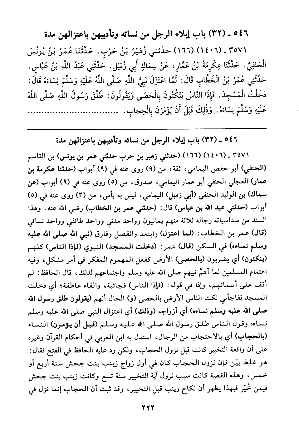 ٣٥٧١ - (٠٦ ١٤) (١٦٦) (حدثني زهير بن حرب حدثني عمر بن يونس) بن القاسم (الحنفي) أبو حفص اليمامي، ثقة، من (٩) روى عنه في (٩) أبواب (حدثنا عكرمة بن عمار) العجلي الحنفي أبو عمار اليمامي، صدوق، من (٥) روى عنه في (٩) أبواب (عن سماك) بن الوليد الحنفي (أبي زميل) اليمامي، ليس به بأس، من (٣) روى عنه في (٥) أبواب (حدثني عبد الله بن عباس) قال: (حدثني عمر بن الخطاب) رضي الله عنه. وهذا السند من سداسياته رجاله ثلاثة منهم يمانيون وواحد مدني وواحد طائفي وواحد نسائي (قال) عمر بن الخطاب: (لما اعتزل) وابتعد وانفصل وفارق (نبي الله صلى الله عليه وسلم نساءه) في السكن (قال) عمر: (دخلت المسجد) النبوي (فإذا الناس) كلهم (ينكتون) أي يضربون (بالحصى) الأرض كفعل المهموم المفكر في أمر مشكل، وفيه اهتمام المسلمين لما أهمَّ نبيهم صلى الله عليه وسلم واجتماعهم لذلك، قال الحافظ: لم أقف على أسمائهم، وإذا في قوله: (فإذا الناس) فجائية، والفاء عاطفة؛ أي دخلت المسجد ففاجأني نكت الناس الأرض بالحصى (و) الحال أنهم (يقولون طلق رسول الله صلى الله عليه وسلم نساءه) أي أزواجه (وذلك) أي اعتزال النبي صلى الله عليه وسلم نساءه وقول الناس طلق رسول الله صلى الله عليه وسلم (قبل أن يؤمرن) النساء (بالحجاب) أي بالاحتجاب من الرجال، استدل به ابن العربي في أحكام القرآن وغيره على أن واقعة التخيير كانت قبل نزول الحجاب، ولكن رد عليه الحافظ في الفتح فقال: هو غلط بيّن فإن نزول الحجاب كان في أول زواج زينب بنت جحش سنة أربع أو خمس، وهذه القصة كانت سبب نزول آية التخيير سنة تسع وكانت زينب بنت جحش فيمن خُيّر فبهذا يظهر أن نكاح زينب قبل التخيير، وقد ثبت أن الحجاب إنما نزل في