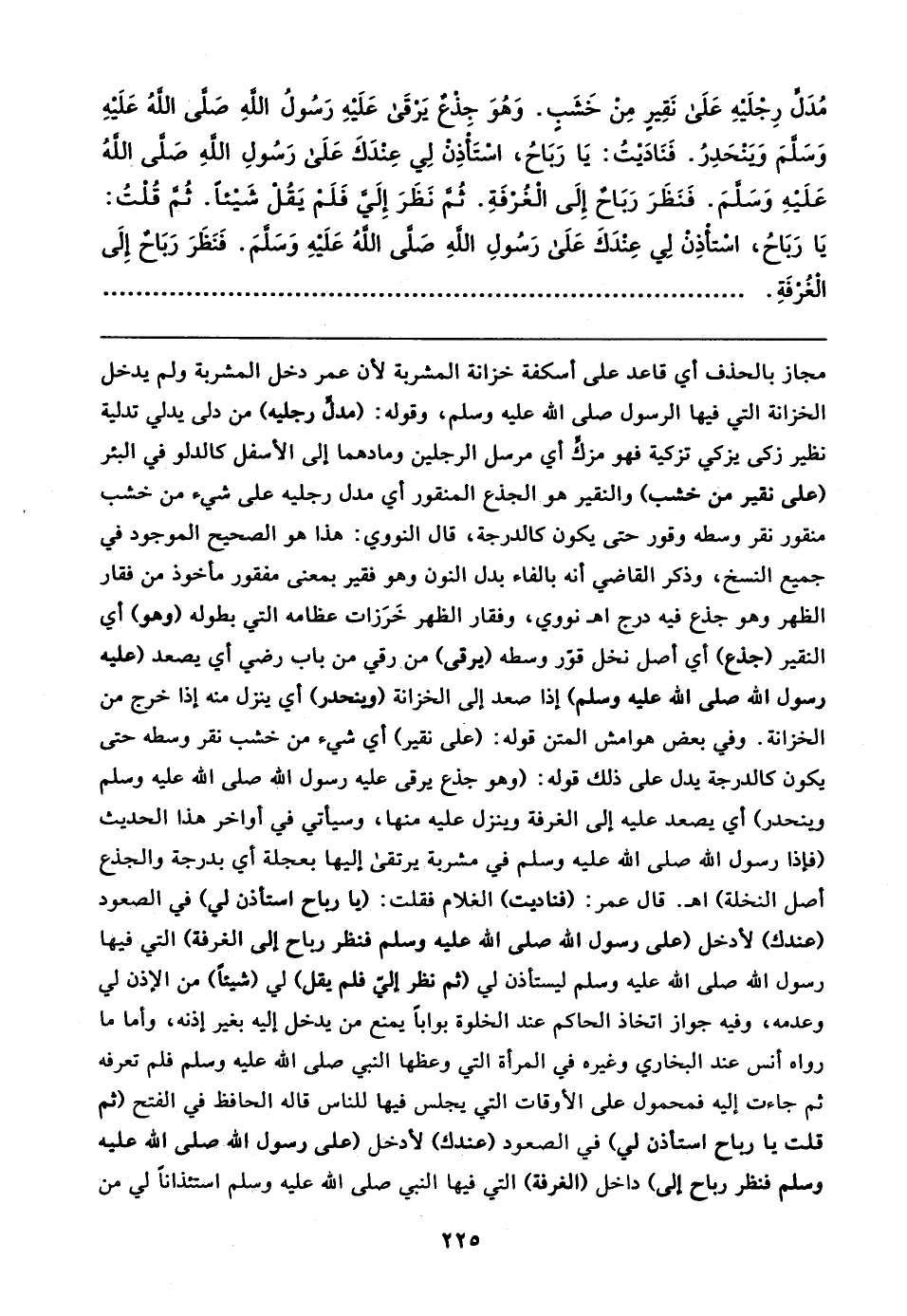 مُدَلٍّ رِجْلَيهِ عَلَى نَقِيرٍ مِنْ خَشَبٍ. وَهُوَ جِذْعٌ يَرْقَى عَلَيهِ رَسُولُ اللهِ صَلَّى اللهُ عَلَيهِ وَسَلَّمَ وَيَنْحَدِرُ. فَنَادَيتُ: يَا رَبَاحُ، اسْتَأذِنْ لِي عِنْدَكَ عَلَى رَسُولِ اللهِ صَلَّى اللهُ عَلَيهِ وَسَلَّمَ. فَنَظَرَ رَبَاحٌ إِلَى الْغُرْفَةِ. ثُمَّ نَظَرَ إِلَيَّ فَلَمْ يَقُلْ شَيئًا. ثُمَّ قُلْتُ: يَا رَبَاحُ، استأذِنْ لِي عِنْدَكَ عَلَى رَسُولِ اللهِ صَلَّى اللهُ عَلَيهِ وَسَلَّمَ. فَنَظَرَ رَبَاحٌ إِلَى الْغُرْفَةِ