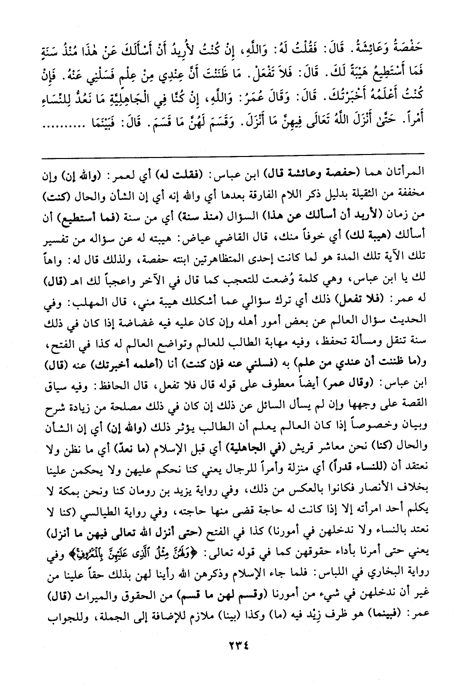 حَفْصَةُ وَعَائِشَةُ. قَال: فَقُلْتُ لَهُ: وَاللهِ، إِنْ كُنْتُ لأُرِيدُ أَنْ أَسْأَلَكَ عَنْ هذَا مُنْذُ سَنَةٍ فَمَا أَسْتَطِيعُ هَيبَةً لَكَ. قَال: فَلَا تَفْعَل. مَا ظَنَنْتَ أَنَّ عِنْدِي مِنْ عِلْمٍ فَسَلْنِي عَنْهُ. فَإِن كُنْتُ أَعْلَمُهُ أَخبَرْتُكَ. قَال: وَقَال عُمَرُ: وَاللهِ، إِنْ كُنَّا فِي الْجَاهِلِيَّةِ مَا نَعُدُّ لِلنِّسَاءِ أَمْرًا. حَتَّى أَنْزَلَ اللهُ تَعَالى فِيهِنَّ مَا أَنْزَلَ. وَقَسَمَ لَهُنَّ مَا قَسَمَ. قَال: فَبَينَمَا