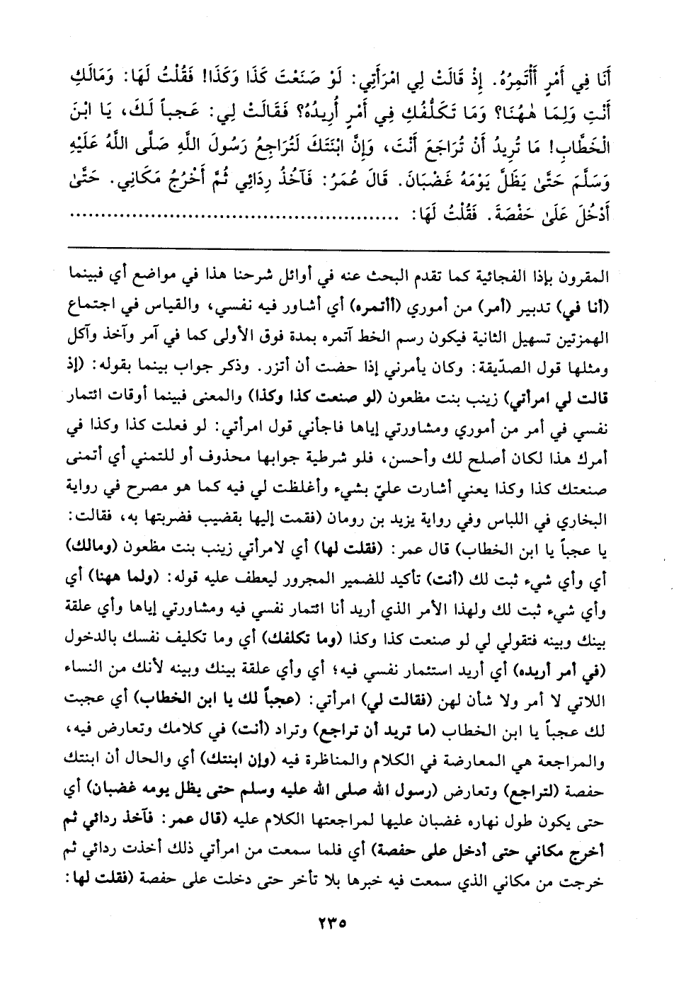 أَنَا فِي أَمْرٍ أَأْتمِرُهُ. إِذْ قَالتْ لِي امْرَأَتِي: لَوْ صَنَعْتَ كَذَا وَكَذَا! فَقُلْتُ لَهَا: وَمَا لكِ أَنْتِ وَلمَا ههُنَا؟ وَمَا تَكَلُّفُكِ فِي أَمْرٍ أُرِيدُهُ؟ فَقَالتْ لِي: عَجبًا لَكَ، يَا ابْنَ الْخَطَّابِ! مَا تُرِيدُ أَنْ تُرَاجَعَ أَنْتَ، وَإِنَّ ابْنَتَكَ لَتُرَاجِعُ رَسُولَ اللهِ صَلَّى اللهُ عَلَيهِ وَسَلَّمَ حَتَّى يَظَلَّ يَوْمَهُ غَضبَانَ. قَال عُمَرُ: فَآخُذُ رِدَائِي ثُمَّ أَخرُجُ مَكَانِي. حَتَّى أَدْخُلَ عَلَى حَفْصَةَ. فَقُلْتُ لَهَا: