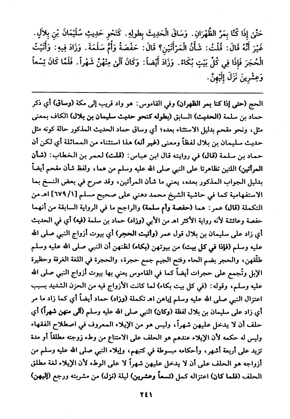 الحج (حتى إذا كنا بمر الظهران) وفي القاموس: هو واد قريب إلى مكة (وساق) أي ذكر حماد بن سلمة (الحديث) السابق (بطوله كنحو حديث سليمان بن بلال) الكاف بمعنى مثل، ونحو مقحم بدليل الاستثناء بعده؛ أي وساق حماد الحديث المذكور حالة كونه مثل حديث سليمان بن بلال لفظًا ومعنى (غير أنه) هذا استثناء من المماثلة أي لكن أن حماد بن سلمة (قال) في روايته قال ابن عباس: (قلت) لعمر بن الخطاب: (شأن المرأتين) اللتين تظاهرتا على النبي صلى الله عليه وسلم من هما، ولفظ شأن مقحم أيضًا بدليل الجواب المذكور بعده، يعني ما شأن المرأتين، وقد صرح في بعض النسخ بما الاستفهامية كما في حاشية الشيخ محمد دهني على صحيح مسلم [١/ ٦٧٩] اهـ من التكملة (قال) عمر: هما (حفصة وأم سلمة) والراجح ما في الرواية السابقة من أنهما حفصة وعائشة لأنه رواية الأكثر اهـ من الأبي (وزاد) حماد بن سلمة (فيه) أي في الحديث أي زاد على سليمان بن بلال قول عمر (وأتيت الحجر) أي بيوت أزواج النبي صلى الله عليه وسلم (فإذا في كل بيت) من بيوتهن (بكاء) لظنهن أن النبي صلى الله عليه وسلم طلّقهن، والحجر بضم الحاء وفتح الجيم جمع حجرة، والحجرة في اللغة الغرفة وحظيرة الإبل وتُجمع على حجرات أيضًا كما في القاموس يعني بها بيوت أزواج النبي صلى الله عليه وسلم، وقوله: (في كل بيت بكاء) لما كانت الأزواج فيه من الحزن الشديد بسبب اعتزال النبي صلى الله عليه وسلم إياهن اهـ تكملة (وزاد) حماد أيضًا أي كما زاد ما مر أي زاد على سليمان بن بلال لفظة (وكان) النبي صلى الله عليه وسلم (آلى منهن شهرًا) أي حلف أن لا يدخل عليهن شهرًا، وليس هو من الإيلاء المعروف في اصطلاح الفقهاء وليس له حكلمه لأن الإيلاء عندهم هو الحلف على الامتناع من وطء زوجته مطلقًا أو مدة تزيد على أربعة أشهر، وأحكامه مبسوطة في كتبهم، وإيلاء النبي صلى الله عليه وسلم من أزواجه هو الحلف على أن لا يدخل عليهن شهرًا لا على الوطء لأن الإيلاء لغة مطلق الحلف (فلما كان) اعتزاله كمل (تسعًا وعشرين) ليلة (نزل) من مشربته ورجع (إليهن)