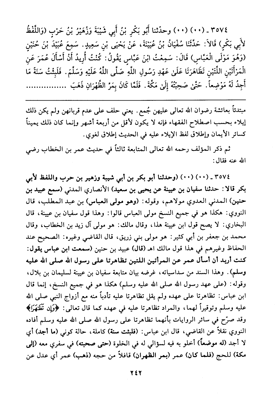 ٣٥٧٤ - (٠٠) (٠٠) وحدَّثنا أَبُو بَكرِ بْنُ أَبِي شَيبَةَ وَزُهَيرُ بْنُ حَرْبٍ (وَاللَّفْظُ لأَبِي بَكْرٍ) قَالا: حَدَّثَنَا سُفْيَانُ بْنُ عُيَينَةَ، عَنْ يَحْيَى بْنِ سَعِيدٍ. سَمِعَ عُبَيدَ بْنَ حُنَينٍ (وَهُوَ مَوْلَى الْعَبَّاسِ) قَال: سَمِعْتُ ابْنَ عَبَّاسٍ يَقُولُ: كُنْتُ أُرِيدُ أَنْ أَسْأَلَ عُمَرَ عَنِ الْمَرْأَتَينِ اللَّتَينِ تَظَاهَرَتَا عَلَى عَهْدِ رَسُولِ اللهِ صَلَّى اللهُ عَلَيهِ وَسَلَّمَ. فَلَبِثْتُ سَنَةً مَا أَجِدُ لَهُ مَوْضِعًا. حَتَّى صَحِبْتُهُ إِلَى مَكَّةَ. فَلَمَّا كَانَ بِمَرِّ الظَّهْرَانِ ذَهَبَ