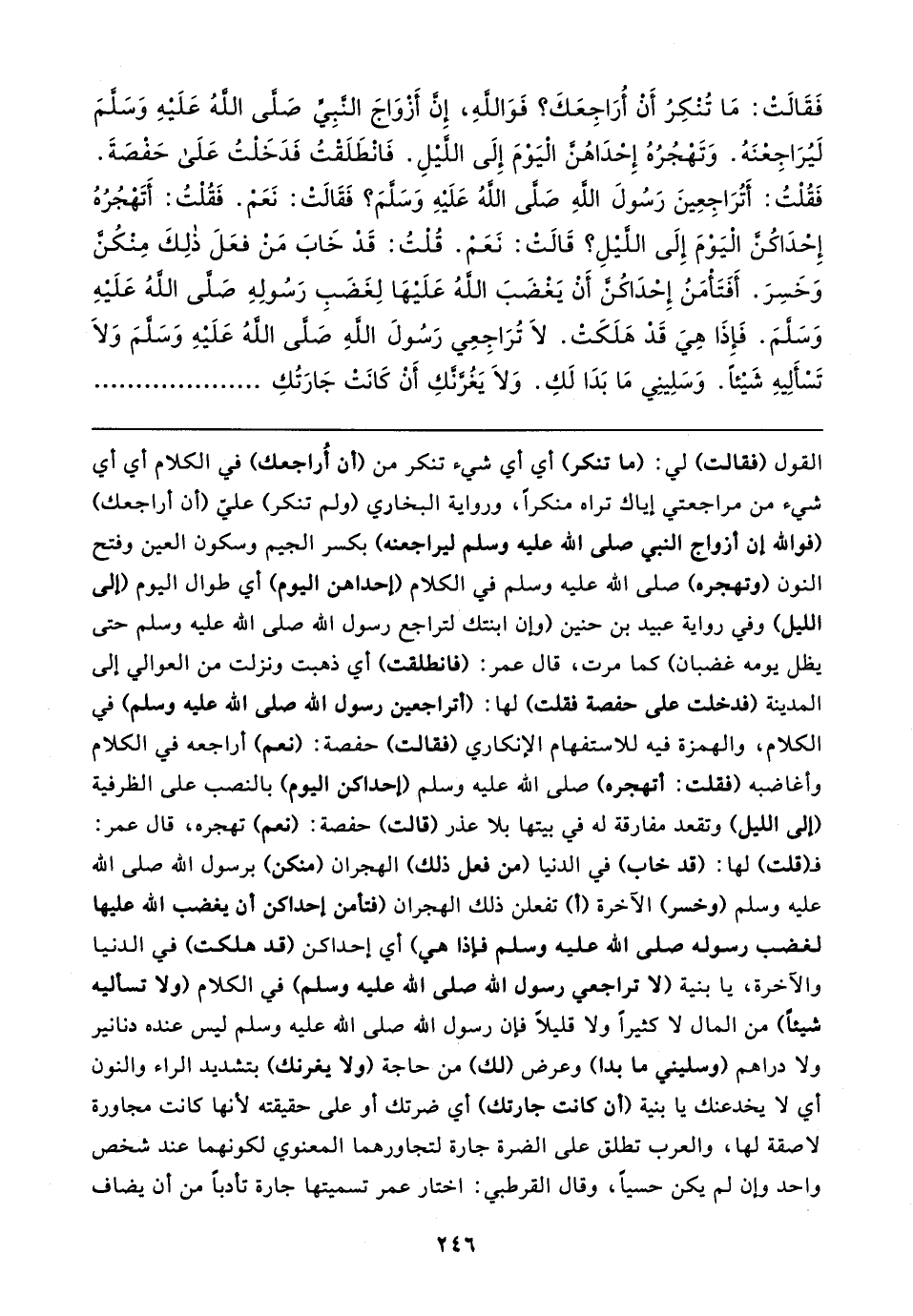 فَقَالتْ: مَا تُنْكِرُ أَنْ أُرَاجِعَكَ؟ فَوَاللهِ، إِنَّ أزوَاجَ النَّبِيَّ صَلَّى اللهُ عَلَيهِ وَسَلَّمَ لَيُرَاجِعْنَهُ. وَتَهْجُرُهُ إِحْدَاهُنَّ الْيَوْمَ إِلَى اللَّيلِ. فَانْطَلَقْتُ فَدَخَلْتُ عَلَى حَفْصَةَ. فَقُلْتُ: أَتُرَاجِعِينَ رَسُولَ اللهِ صَلَّى اللهُ عَلَيهِ وَسَلَّمَ؟ فَقَالت: نَعَمْ. فَقُلْتُ: أَتَهْجُرُهُ إِحْدَاكُنَّ الْيَوْمَ إِلَى اللَّيلِ؟ قَالت: نَعَمْ. قُلْتُ: قَدْ خَابَ مَنْ فعَلَ ذلِكَ مِنْكُنَّ وَخَسِرَ. أَفَتَأْمَنُ إِحْدَاكُنَّ أَنْ يَغْضَبَ اللهُ عَلَيهَا لِغَضَبِ رَسُولِهِ صَلَّى اللهُ عَلَيهِ وَسَلَّمَ. فَإِذَا هِيَ قَدْ هَلَكَتْ. لَا تُرَاجِعِي رَسُولَ اللهِ صَلَّى اللهُ عَلَيهِ وَسَلَّمَ وَلَا تَسْأَلِيهِ شَيئًا. وَسَلِينِي مَا بَدَا لَكِ. وَلَا يَغُرَّنَّكِ أَنْ كَانَت جَارَتُكِ