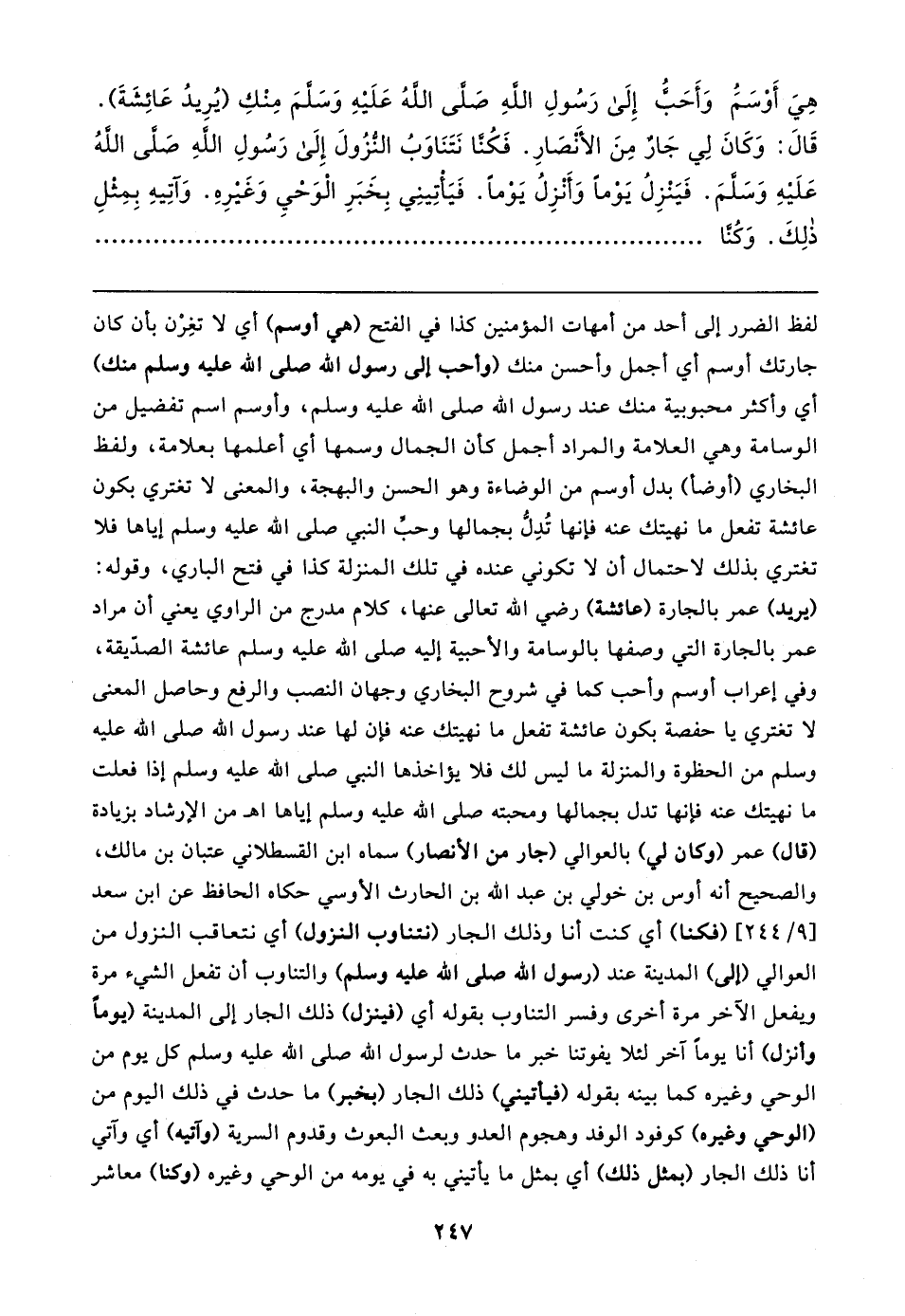 لفظ الضرر إلى أحد من أمهات المؤمنين كذا في الفتح (هي أوسم) أي لا تغِرْن بأن كان جارتك أوسم أي أجمل وأحسن منك (وأحب إلى رسول الله صلى الله عليه وسلم منك) أي وأكثر محبوبية منك عند رسول الله صلى الله عليه وسلم، وأوسم اسم تفضيل من الوسامة وهي العلامة والمراد أجمل كأن الجمال وسمها أي أعلمها بعلامة، ولفظ البخاري (أوضأ) بدل أوسم من الوضاءة وهو الحسن والبهجة، والمعنى لا تغتري بكون عائشة تفعل ما نهيتك عنه فإنها تُدِلُّ بجمالها وحبِّ النبي صلى الله عليه وسلم إياها فلا تغتري بذلك لاحتمال أن لا تكوني عنده في تلك المنزلة كذا في فتح الباري، وقوله: (يريد) عمر بالجارة (عائشة) رضي الله تعالى عنها، كلام مدرج من الراوي يعني أن مراد عمر بالجارة التي وصفها بالوسامة والأحبية إليه صلى الله عليه وسلم عائشة الصدّيقة، وفي إعراب أوسم وأحب كما في شروح البخاري وجهان النصب والرفع وحاصل المعنى لا تغتري يا حفصة بكون عائشة تفعل ما نهيتك عنه فإن لها عند رسول الله صلى الله عليه وسلم من الحظوة والمنزلة ما ليس لك فلا يؤاخذها النبي صلى الله عليه وسلم إذا فعلت ما نهيتك عنه فإنها تدل بجمالها ومحبته صلى الله عليه وسلم إياها اهـ من الإرشاد بزيادة (قال) عمر (وكان لي) بالعوالي (جار من الأنصار) سماه ابن القسطلاني عتبان بن مالك، والصحيح أنه أوس بن خولي بن عبد الله بن الحارث الأوسي حكاه الحافظ عن ابن سعد [٩/ ٢٤٤] (فكنا) أي كنت أنا وذلك الجار (نتناوب النزول) أي نتعاقب النزول من العوالي (إلى) المدينة عند (رسول الله صلى الله عليه وسلم) والتناوب أن تفعل الشيء مرة ويفعل الآخر مرة أخرى وفسر التناوب بقوله أي (فينزل) ذلك الجار إلى المدينة (يومًا وأنزل) أنا يومًا آخر لئلا يفوتنا خبر ما حدث لرسول الله صلى الله عليه وسلم كل يوم من الوحي وغيره كما بينه بقوله (فيأتيني) ذلك الجار (بخبر) ما حدث في ذلك اليوم من (الوحي وغيره) كوفود الوفد وهجوم العدو وبعث البعوث وتدوم السرية (وآتيه) أي وآتي أنا ذلك الجار (بمثل ذلك) أي بمثل ما يأتيني به في يومه من الوحي وغيره (وكنا) معاشر