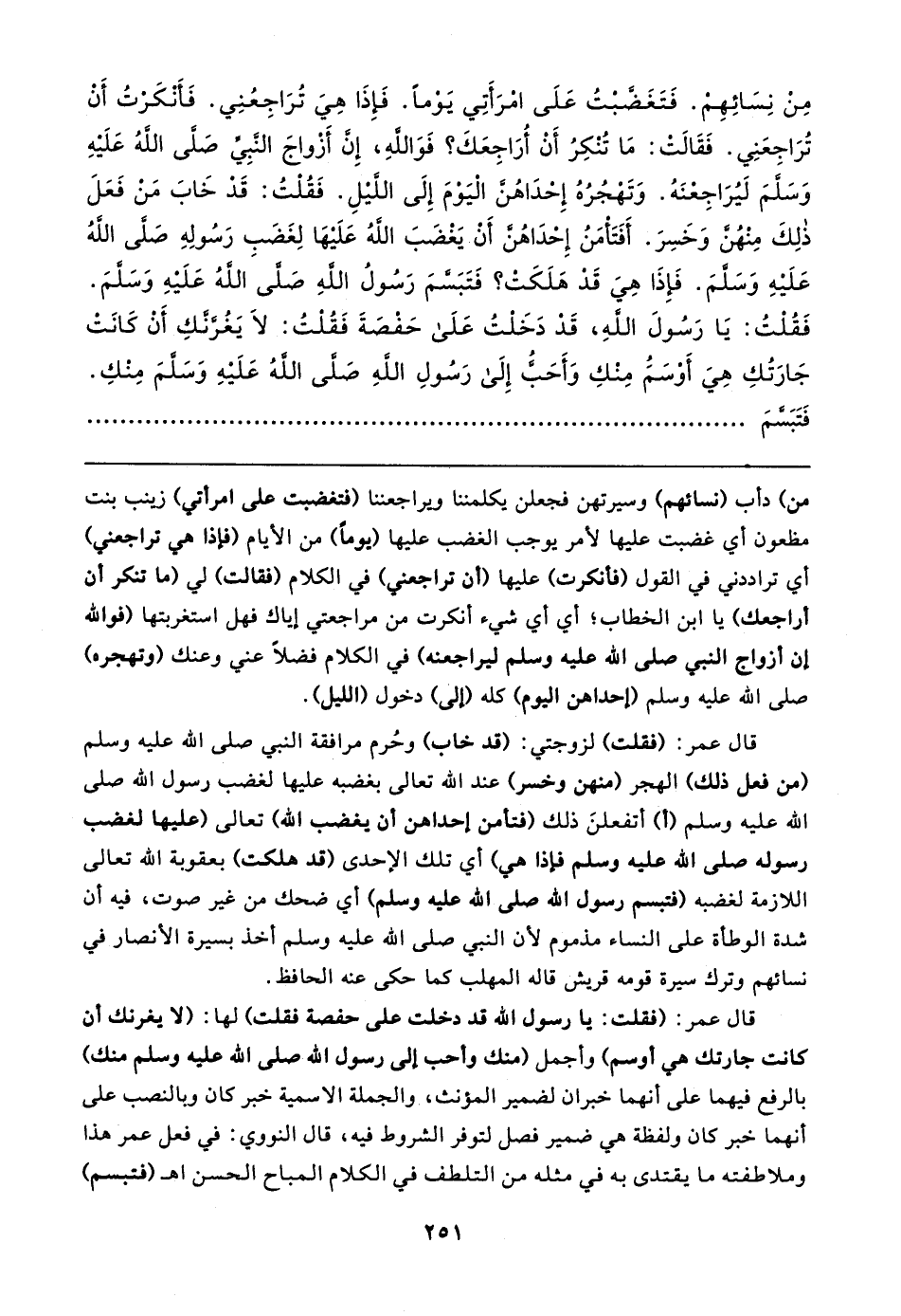 مِنْ نِسَائِهِمْ. فَتَغَضَّبْتُ عَلَى امْرَأَتِي يَوْمًا. فَإِذَا هِيَ تُرَاجِعُنِي. فَأَنْكَرْتُ أَنْ تُرَاجِعَنِي. فَقَالت: مَا تُنْكِرُ أنْ أُرَاجِعَكَ؟ فَوَاللهِ، إِنَّ أَزْواجَ النَّبِيِّ صَلَّى اللهُ عَلَيهِ وَسَلَّمَ لَيُرَاجِعْنَهُ. وَتَهْجُرُهُ إِحْدَاهُنَّ الْيَوْمَ إِلَى اللَّيلِ. فَقُلْتُ: قَدْ خَابَ مَنْ فَعَلَ ذلِكَ مِنْهُنَّ وَخَسِرَ. أَفَتَأْمَنُ إِحْدَاهُنَّ أَنْ يَغضَبَ اللهُ عَلَيهَا لِغَضَبِ رَسُولِهِ صَلَّى اللهُ عَلَيهِ وَسَلَّمَ. فَإِذَا هِيَ قَدْ هَلَكَت؟ فَتَبَسَّمَ رَسُولُ اللهِ صَلَّى اللهُ عَلَيهِ وَسَلَّمَ. فَقُلْتُ: يَا رَسُولَ اللهِ، قَدْ دَخَلْتُ عَلَى حَفْصَةَ فَقُلْتُ: لَا يَغُرَّنَّكِ أَنْ كَانَتْ جَارَتُكِ هِيَ أَوْسَمُ مِنْكِ وَأَحَبَّ إِلَى رَسُولِ اللهِ صَلَّى اللهُ عَلَيهِ وَسَلَّمَ مِنْكِ. فَتَبَسَّمَ