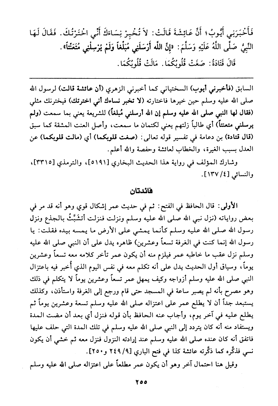 الأولى: قال الحافظ في الفتح: ثم في حديث عمر إشكال قوي وهو أنه قد مر في بعض رواياته (نزل نبي الله صلى الله عليه وسلم ونزلت فنزلت أتشَبَّثُ بالجذع ونزل رسول الله صلى الله عليه وسلم كأنما يمشي على الأرض ما يمسه بيده فقلت: يا رسول الله إنما كنت في الغرفة تسعًا وعشرين) ظاهره يدل على أن النبي صلى الله عليه وسلم نزل عقب ما خاطبه عمر فيلزم منه أن يكون عمر تأخر كلامه معه تسعًا وعشرين يومًا، وسياق أول الحديث يدل على أنه تكلم معه في نفس اليوم الذي أُخبر فيه باعتزال النبي صلى الله عليه وسلم أزواجه وكيف يمهل عمر تسعًا وعشرين يومًا لا يتكلم في ذلك وهو مصرح بأنه لم يصبر ساعة في المسجد حتى قام ورجع إلى الغرفة واستأذن، وكذلك يستبعد جدًّا أن لا يطلع عمر على اعتزاله صلى الله عليه وسلم تسعة وعشرين يومًا ثم يطلع عليه في آخر يوم، وأجاب عنه الحافظ بأن قوله فنزل أي بعد أن مضت المدة ويستفاد منه أنه كان يتردد إلى النبي صلى الله عليه وسلم في تلك المدة التي حلف عليها فاتفق أنه كان عنده صلى الله عليه وسلم عند إرادته النزول فنزل معه ثم خشي أن يكون نسي فذكَّره كما ذكَّرته عائشة كذا في فتح الباري [٩/ ٢٤٩ و ٢٥٠].