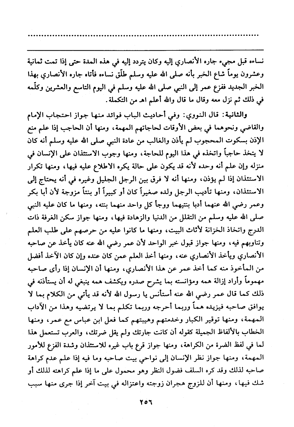والثانية: قال النووي: وفي أحاديث الباب فوائد منها جواز احتجاب الإمام والقاضي ونحوهما في بعض الأوقات لحاجاتهم المهمة، ومنها أن الحاجب إذا علم منع الإذن بسكوت المحجوب لم يأذن والغالب من عادة النبي صلى الله عليه وسلم أنه كان لا يتخذ حاجبًا واتخذه في هذا اليوم للحاجة، ومنها وجوب الاستئذان على الإنسان في منزله وإن علم أنه وحده لأنه قد يكون على حالة يكره الاطلاع عليه فيها، ومنها تكرار الاستئذان إذا لم يؤذن، ومنها أنه لا فرق بين الرجل الجليل وغيره في أنه يحتاج إلى الاستئذان، ومنها تأديب الرجل ولده صغيرًا كان أو كبيرًا أو بنتًا مزوجة لأن أبا بكر وعمر رضي الله عنهما أدبا ينتيهما ووجأ كل واحد منهما بنته، ومنها ما كان عليه النبي صلى الله عليه وسلم من التقلل من الدنيا والزهادة فيها، ومنها جواز سكن الغرفة ذات الدرج واتخاذ الخزانة لأثاث البيت، ومنها ما كانوا عليه من حرصهم على طلب العلم وتناوبهم فيه، ومنها جواز قبول خبر الواحد لأن عمر رضي الله عنه كان يأخذ عن صاحبه الأنصاري ويأخذ الأنصاري عنه، ومنها أخذ العلم عمن كان عنده وإن كان الآخذ أفضل من المأخوذ منه كما أخذ عمر عن هذا الأنصاري، ومنها أن الإنسان إذا رأى صاحبه مهمومًا وأراد إزالة همه ومؤانسته بما يشرح صدره ويكشف همه ينبغي له أن يستأذنه في ذلك كما قال عمر رضي الله عنه أستأنس يا رسول الله لأنه قد يأتي من الكلام بما لا يوافق صاحبه فيزيده همًا وربما أحرجه وربما تكلم بما لا يرتضيه وهذا من الآداب المهمة، ومنها توقير الكبار وخدمتهم وهيبتهم كما فعل ابن عباس مع عمر، ومنها الخطاب بالألفاظ الجميلة كقوله أن كانت جارتك ولم يقل ضرتك، والعرب تستعمل هذا لما في لفظ الضرة من الكراهة، ومنها جواز قرع باب غيره للاستئذان وشدة الفزع للأمور المهمة، ومنها جواز نظر الإنسان إلى نواحي بيت صاحبه وما فيه إذا علم عدم كراهة صاحبه لذلك وقد كره السلف فضول النظر وهو محمول على ما إذا علم كراهته لذلك أو شك فيها، ومنها أن للزوج هجران زوجته واعتزاله في بيت آخر إذا جرى منها سبب