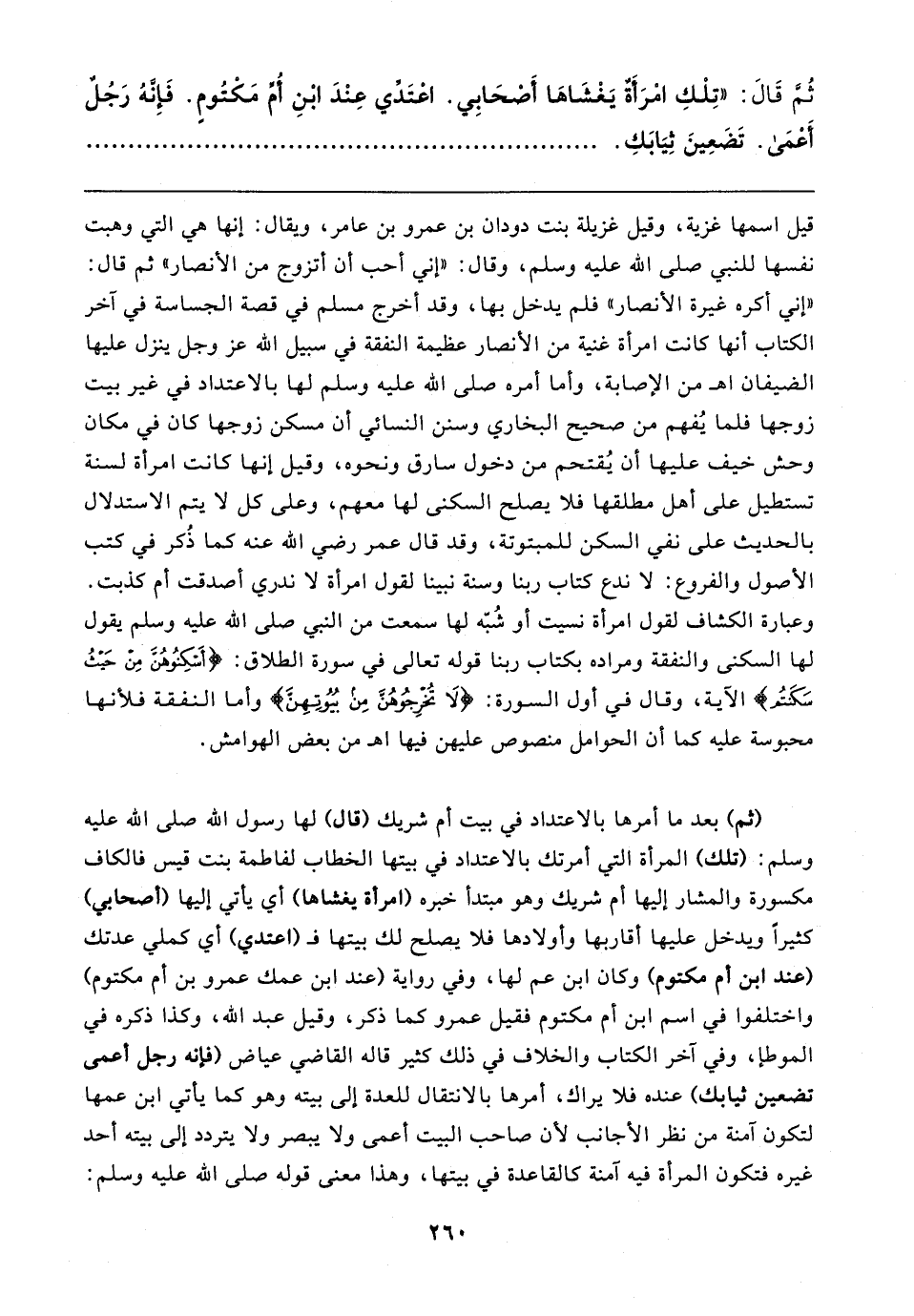 ثُمَّ قَال: "تِلْكِ امْرَأَةٌ يَغْشَاهَا أَصْحَابِي. اعْتَدِّي عِنْدَ ابْنِ أُمِّ مَكْتُومٍ. فَإِنَّهُ رَجُلٌ أَعْمَى. تَضَعِينَ ثِيَابَكِ