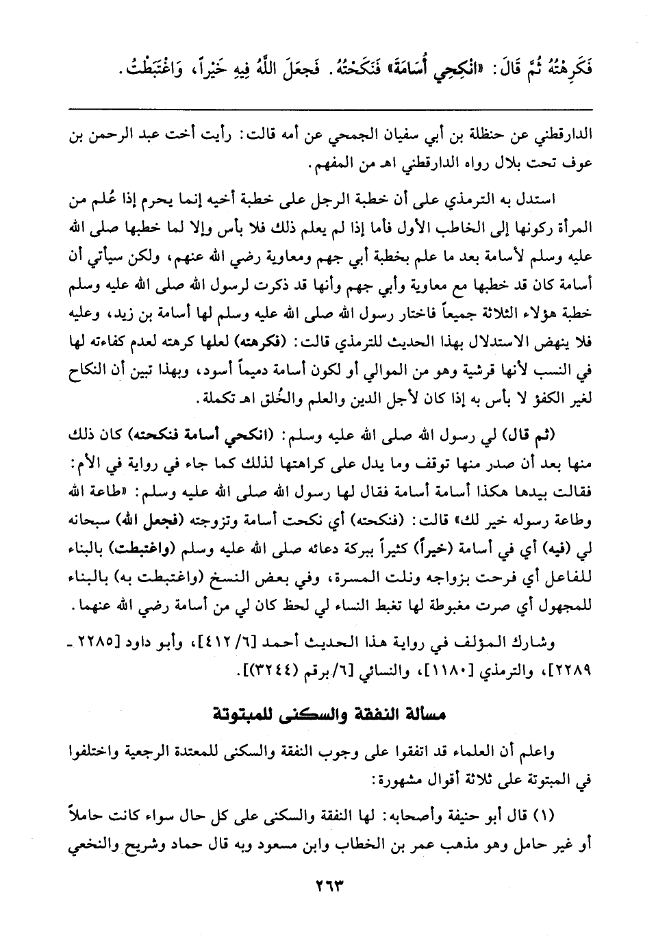 استدل به الترمذي على أن خطبة الرجل على خطبة أخيه إنما يحرم إذا عُلم من المرأة ركونها إلى الخاطب الأول فأما إذا لم يعلم ذلك فلا بأس وإلا لما خطبها صلى الله عليه وسلم لأسامة بعد ما علم بخطبة أبي جهم ومعاوية رضي الله عنهم، ولكن سيأتي أن أسامة كان قد خطبها مع معاوية وأبي جهم وأنها قد ذكرت لرسول الله صلى الله عليه وسلم خطبة هؤلاء الثلاثة جميعًا فاختار رسول الله صلى الله عليه وسلم لها أسامة بن زيد، وعليه فلا ينهض الاستدلال بهذا الحديث للترمذي قالت: (فكرهته) لعلها كرهته لعدم كفاءته لها في النسب لأنها قرشية وهو من الموالي أو لكون أسامة دميمًا أسود، وبهذا تبين أن النكاح لغير الكفؤ لا بأس به إذا كان لأجل الدين والعلم والخُلق اهـ تكملة.