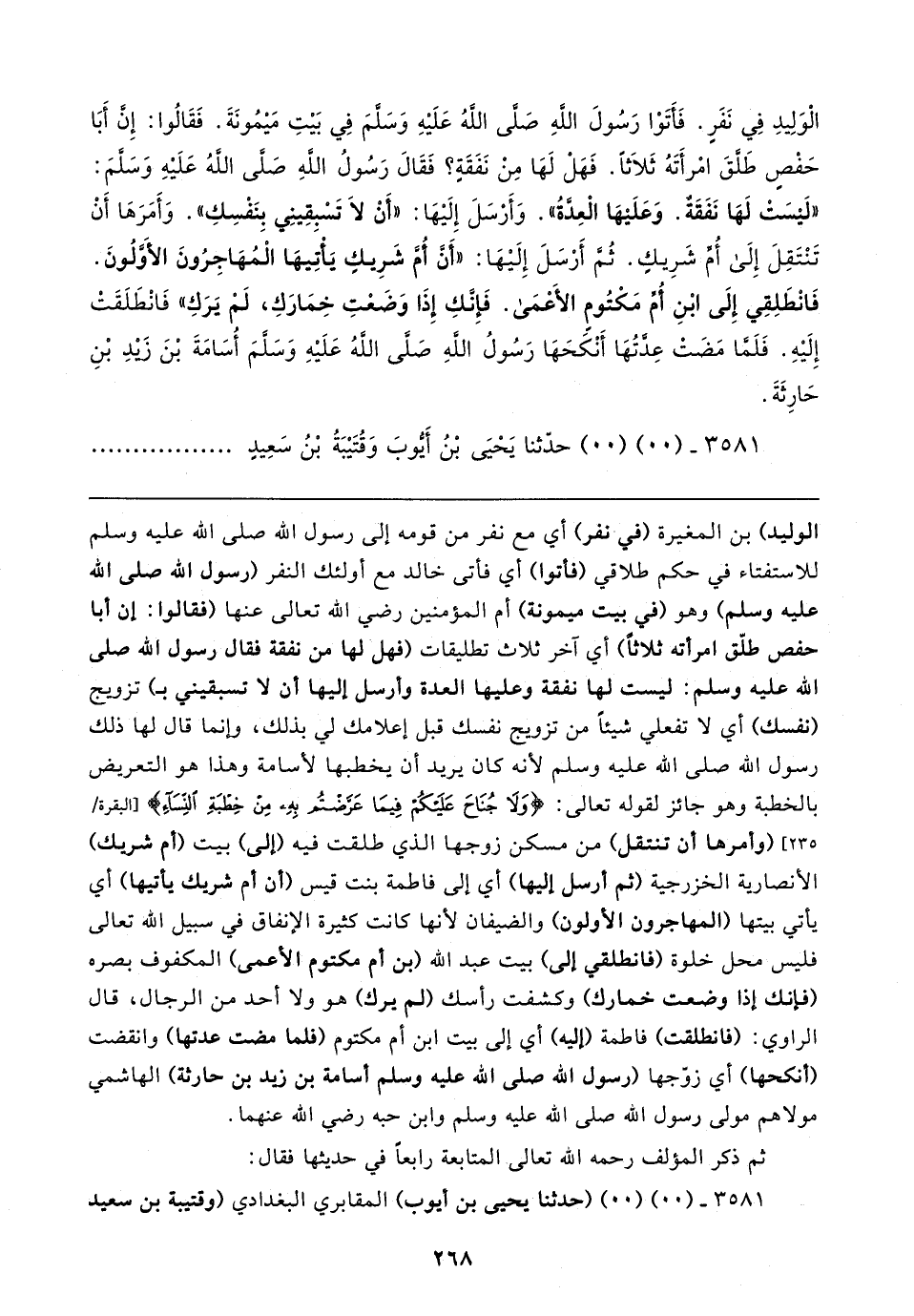 الْوَلِيدِ فِي نَفَرٍ. فَأَتَوْا رَسُولَ اللهِ صَلَّى اللهُ عَلَيهِ وَسَلَّمَ فِي بَيتِ مَيمُونَةَ. فَقَالُوا: إِنَّ أَبَا حَفْصٍ طَلَّقَ امْرأَتَهُ ثَلاثًا. فَهَلْ لَهَا مِنْ نَفَقَةٍ؟ فَقَال رَسُولُ اللهِ صَلَّى اللهُ عَلَيهِ وَسَلَّمَ: "لَيسَتْ لَهَا نَفَقَةٌ. وَعَلَيهَا الْعِدَّةُ". وَأَرْسَلَ إِلَيهَا: "أَنْ لَا تَسْبِقِينِي بِنَفْسِكِ". وَأَمَرَهَا أَنْ تَنْتَقِلَ إِلَى أُمِّ شَرِيكٍ. ثُمَّ أَرْسَلَ إِلَيهَا: "أَنَّ أُمَّ شَرِيكٍ يَأْتِيهَا الْمُهَاجِرُونَ الأَوَّلُونَ. فَانْطَلِقِي إِلَى ابْنِ أُمِّ مَكْتُومٍ الأَعْمَى. فَإِنَّكِ إِذَا وَضَعْتِ خِمَارَكِ، لَمْ يَرَكِ" فَانْطَلَقَتْ إِلَيهِ. فَلَمَّا مَضَتْ عِدَّتُهَا أَنْكَحَهَا رَسُولُ اللهِ صَلَّى اللهُ عَلَيهِ وَسَلَّمَ أُسَامَةَ بْنَ زيدِ بْنِ حَارِثَةَ.