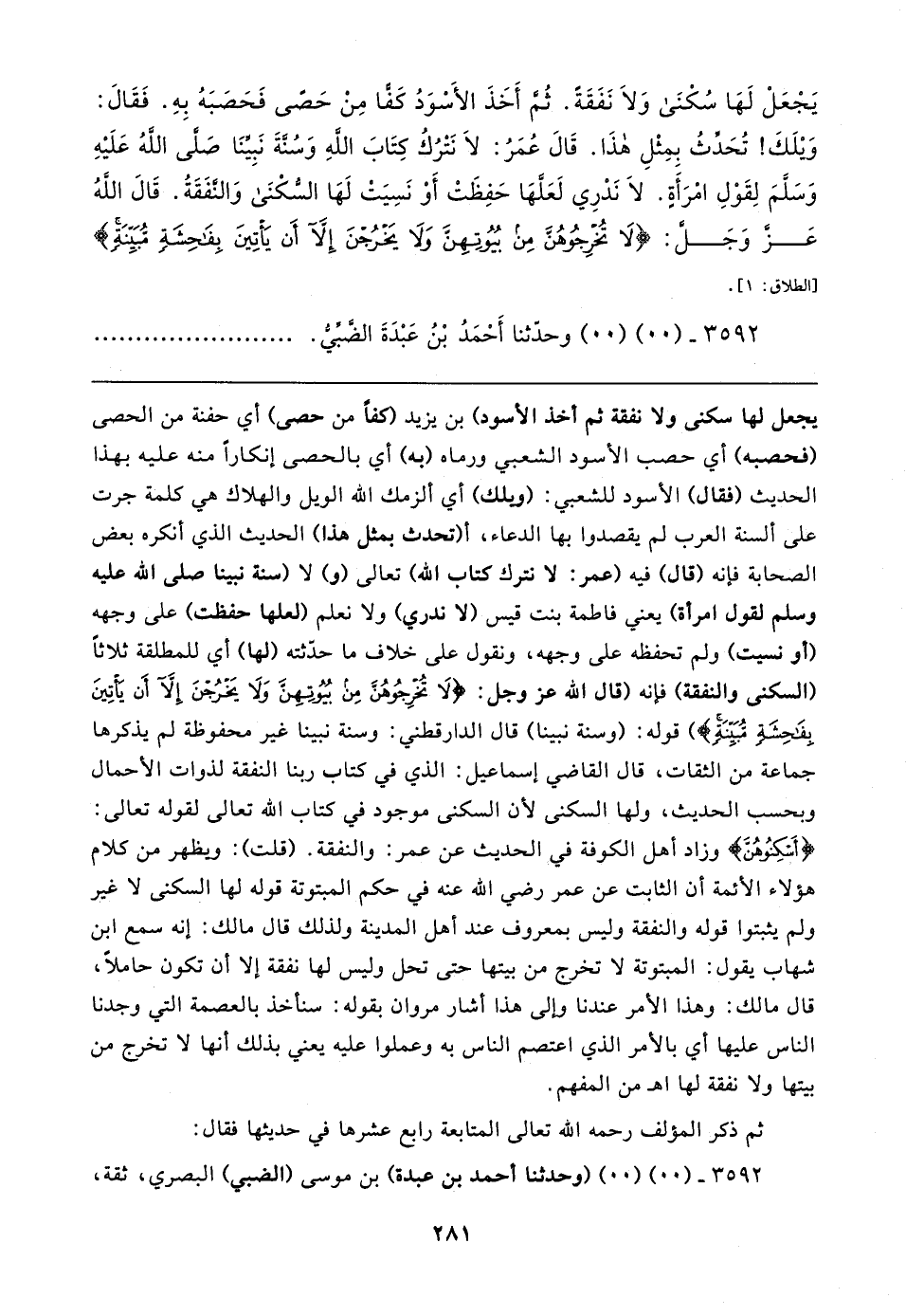يَجْعَلْ لَهَا سُكْنَى وَلَا نَفَقَةً. ثُمَّ أَخَذَ الأَسْوَدُ كَفًّا مِنْ حَصَّى فَحَصَبَهُ بِهِ. فَقَال: وَيلَكَ! تُحَدِّثُ بِمِثْلِ هذَا. قَال عُمَرُ: لَا نَتْرُكُ كِتَابَ اللهِ وَسُنَّةَ نَبِيِّنَا صَلَّى اللَّهُ عَلَيهِ وَسَلَّمَ لِقَوْلِ امْرَأَةٍ. لَا نَدْرِي لَعَلَّهَا حَفِظَتْ أَوْ نَسِيَتْ لَهَا السُّكْنَى وَالنَّفَقَةُ. قَال اللهُ عَزَّ وَجَلَّ: {لَا تُخْرِجُوهُنَّ مِنْ بُيُوتِهِنَّ وَلَا يَخْرُجْنَ إلا أَنْ يَأْتِينَ بِفَاحِشَةٍ مُبَيِّنَةٍ} [الطلاق: ١].