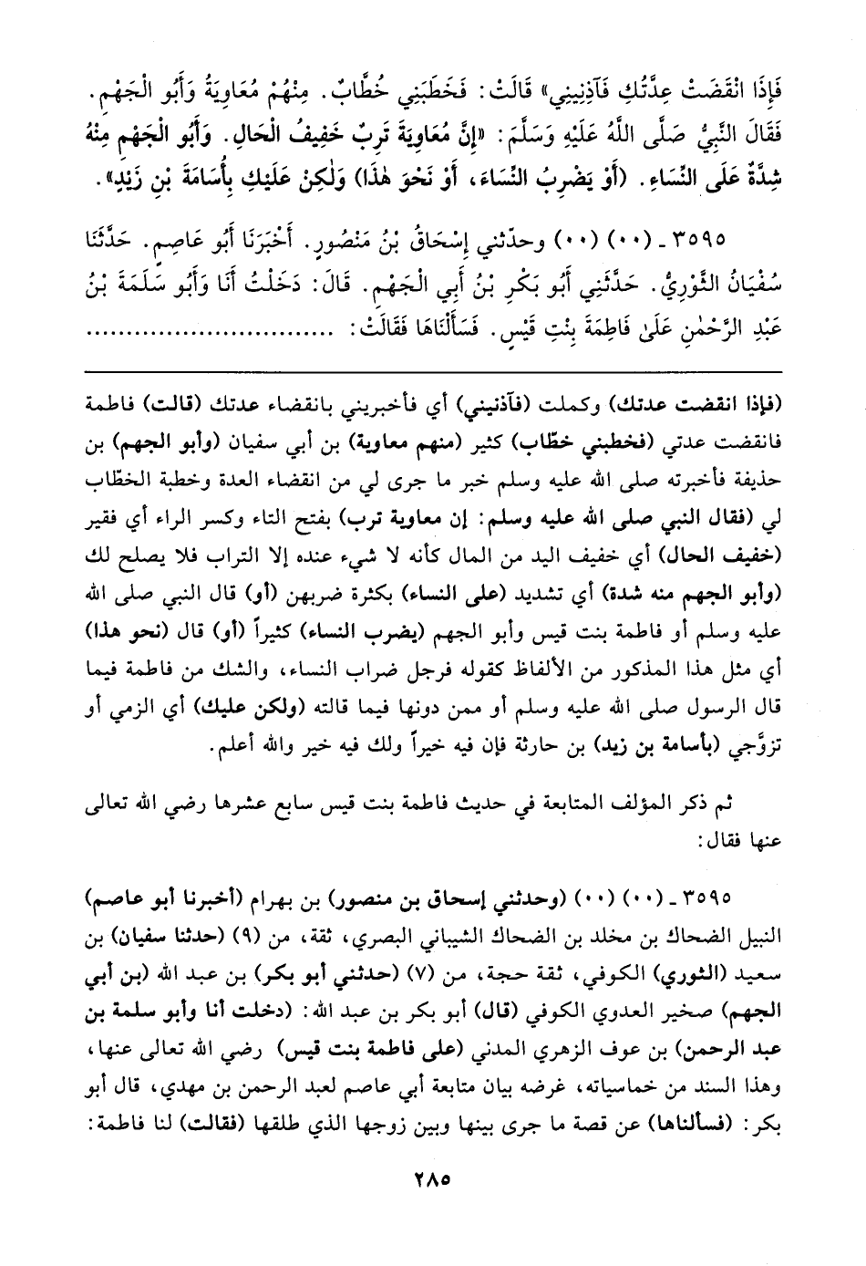 ٣٥٩٥ - (٠٠) (٠٠) (وحدثني إسحاق بن منصور) بن بهرام (أخبرنا أبو عاصم) النبيل الضحاك بن مخلد بن الضحاك الشيباني البصري، ثقة، من (٩) (حدثنا سفيان) بن سعيد (الثوري) الكوفي، ثقة حجة، من (٧) (حدثني أبو بكر) بن عبد الله (بن أبي الجهم) صخير العدوي الكوفي (قال) أبو بكر بن عبد الله: (دخلت أنا وأبو سلمة بن عبد الرحمن) بن عوف الزهري المدني (على فاطمة بنت قيس) رضي الله تعالى عنها، وهذا السند من خماسياته، غرضه بيان متابعة أبي عاصم لعبد الرحمن بن مهدي، قال أبو بكر: (فسألناها) عن قصة ما جرى بينها وبين زوجها الذي طلقها (فقالت) لنا فاطمة: