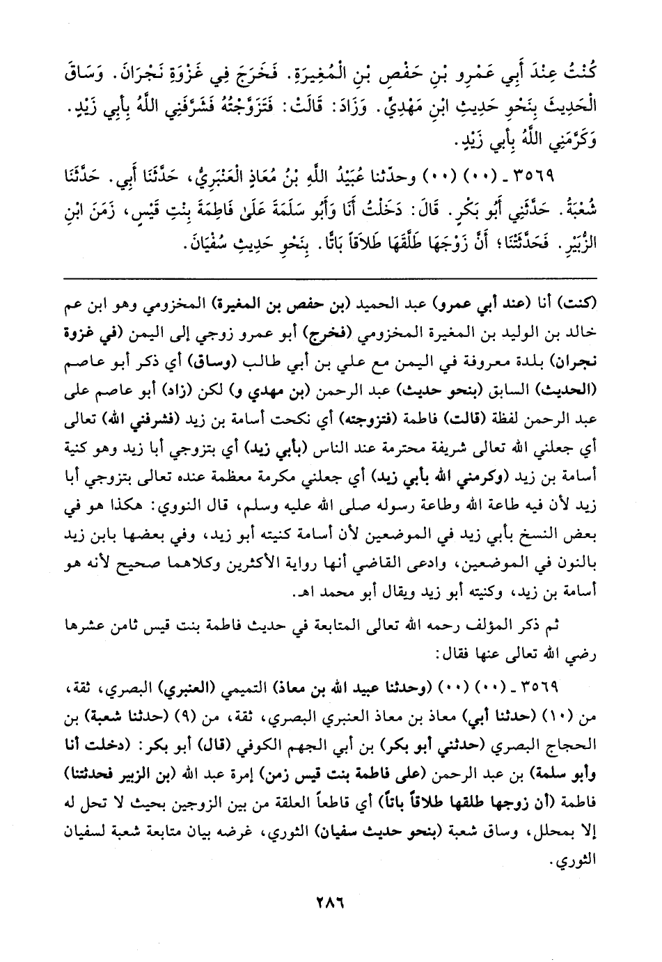 ٣٥٦٩ - (٠٠) (٠٠) (وحدثنا عبيد الله بن معاذ) التميمي (العنبري) البصري، ثقة، من (١٠) (حدثنا أبي) معاذ بن معاذ العنبري البصري، ثقة، من (٩) (حدثنا شعبة) بن الحجاج البصري (حدثني أبو بكر) بن أبي الجهم الكوفي (قال) أبو بكر: (دخلت أنا وأبو سلمة) بن عبد الرحمن (على فاطمة بنت قيس زمن) إمرة عبد الله (بن الزبير فحدثتنا) فاطمة (أن زوجها طلقها طلاقًا باتًا) أي قاطعًا العلقة من بين الزوجين بحيث لا تحل له إلا بمحلل، وساق شعبة (بنحو حديث سفيان) الثوري، غرضه بيان متابعة شعبة لسفيان الثوري.