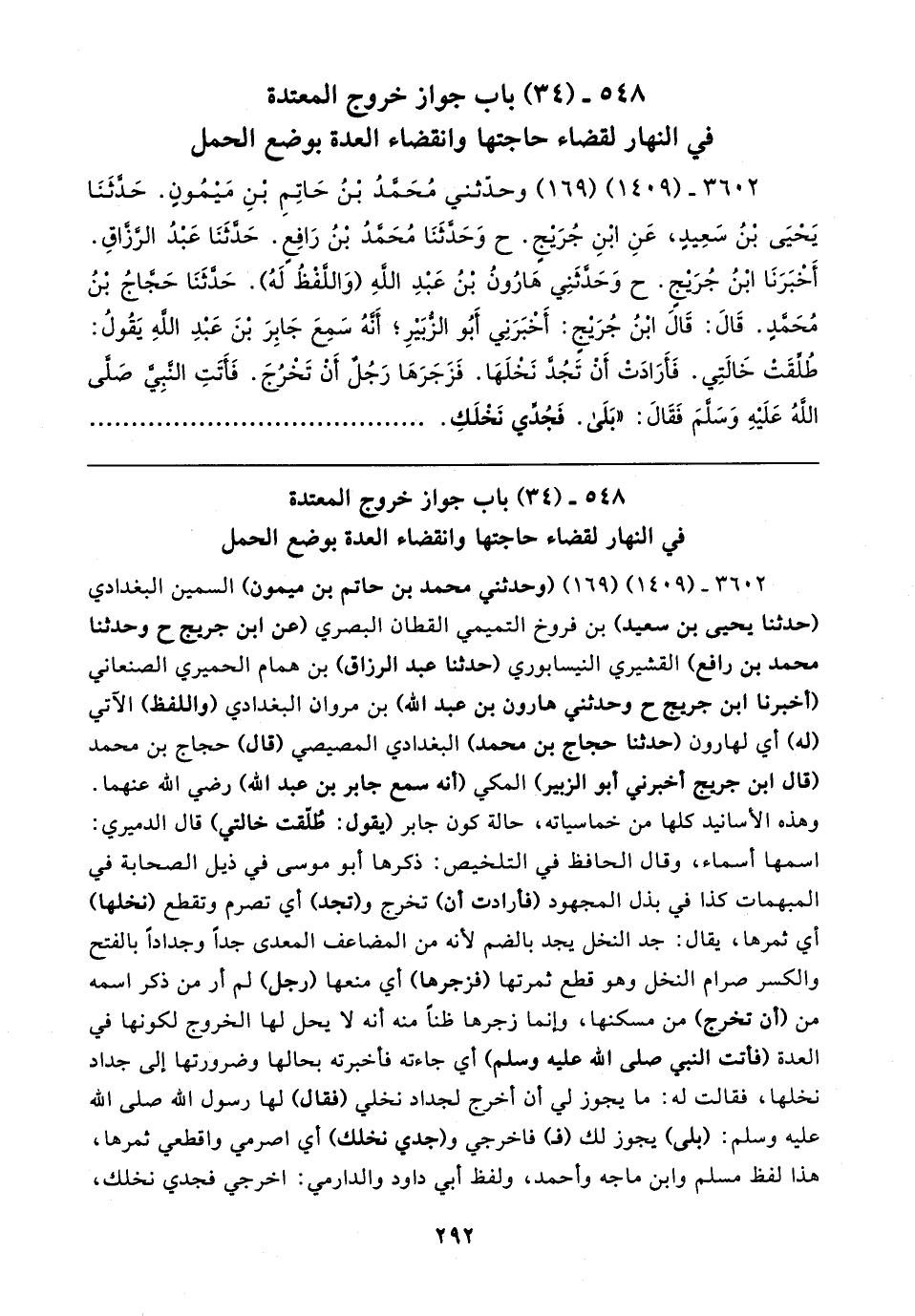 ٣٦٠٢ - (١٤٠٩) (١٦٩) (وحدثني محمد بن حاتم بن ميمون) السمين البغدادي (حدثنا يحيى بن سعيد) بن فروخ التميمي القطان البصري (عن ابن جريج ح وحدثنا محمد بن رافع) القشيري النيسابوري (حدثنا عبد الرزاق) بن همام الحميري الصنعاني (أخبرنا ابن جريج ح وحدثني هارون بن عبد الله) بن مروان البغدادي (واللفظ) الآتي (له) أي لهارون (حدثنا حجاج بن محمد) البغدادي المصيصي (قال) حجاج بن محمد (قال ابن جريج أخبرني أبو الزبير) المكي (أنه سمع جابر بن عبد الله) رضي الله عنهما. وهذه الأسانيد كلها من خماسياته، حالة كون جابر (يقول: طُلّقت خالتي) قال الدميري: اسمها أسماء، وقال الحافظ في التلخيص: ذكرها أبو موسى في ذيل الصحابة في المبهمات كذا في بذل المجهود (فأرادت أن) تخرج و (تجد) أي تصرم وتقطع (نخلها) أي ثمرها، يقال: جد النخل يجد بالضم لأنه من المضاعف المعدى جدًّا وجدادًا بالفتح والكسر صرام النخل وهو قطع ثمرتها (فزجرها) أي منعها (رجل) لم أر من ذكر اسمه من (أن تخرج) من مسكنها، وإنما زجرها ظنًّا منه أنه لا يحل لها الخروج لكونها في العدة (فأتت النبي صلى الله عليه وسلم) أي جاءته فأخبرته بحالها وضرورتها إلى جداد نخلها، فقالت له: ما يجوز لي أن أخرج لجداد نخلي (فقال) لها رسول الله صلى الله عليه وسلم: (بلى) يجوز لك (فـ) فاخرجي و (جدي نخلك) أي اصرمي واقطعي ثمرها، هذا لفظ مسلم وابن ماجه وأحمد، ولفظ أبي داود والدارمي: اخرجي فجدي نخلك،