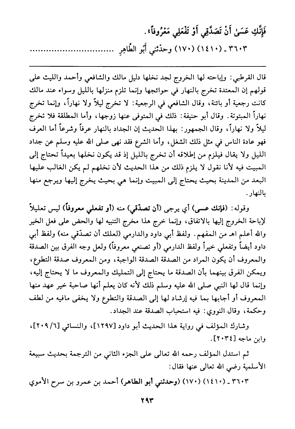 وقوله: (فإنك عسى) أي يرجى (أن تصدّقي) منه (أو تفعلي معروفًا) ليس تعليلًا لإباحة الخروج إليها بالاتفاق، وإنما خرج هذا مخرج التنبيه لها والحض على فعل الخير والله أعلم اهـ من المفهم. ولفظ أبي داود والدارمي (لعلك أن تصدّقي منه) ولفظ أبي داود أيضًا وتفعلي خيرًا ولفظ الدارمي (أو تصنعي معروفًا) ولعل وجه الفرق بين الصدقة والمعروف أن يكون المراد من الصدقة الصدقة الواجبة، ومن المعروف صدقة التطوع، ويمكن الفرق بينهما بأن الصدقة ما يحتاج إلى التمليك والمعروف ما لا يحتاج إليه، وإنما قال لها النبي صلى الله عليه وسلم ذلك لأنه كان يعلم أنها صاحبة خير عهد منها المعروف أو أجابها بما فيه إرشاد لها إلى الصدقة والتطوع ولا يخفى ما فيه من لطف وحكمة، وقال النووي: فيه استحباب الصدقة عند الجداد.
