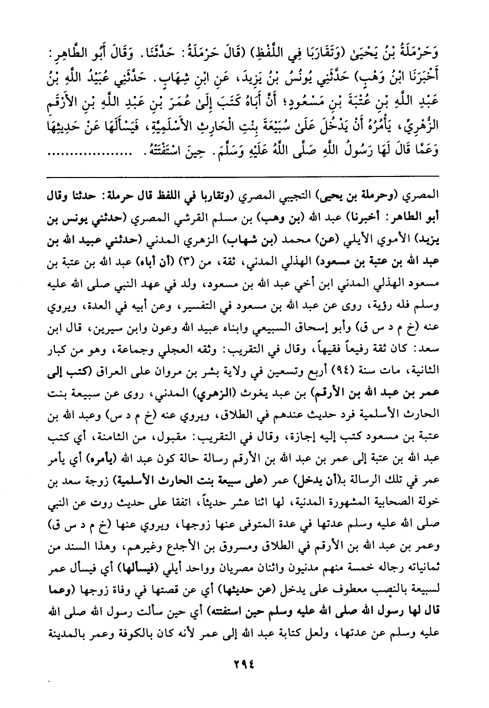 المصري (وحرملة بن يحيى) التجيبي المصري (وتقاربا في اللفظ قال حرملة: حدثنا وقال أبو الطاهر: أخبرنا) عبد الله (بن وهب) بن مسلم القرشي المصري (حدثني يونس بن يزيد) الأموي الأيلي (عن) محمد (بن شهاب) الزهري المدني (حدثني عبيد الله بن عبد الله بن عتبة بن مسعود) الهذلي المدني، ثقة، من (٣) (أن أباه) عبد الله بن عتبة بن مسعود الهذلي المدني ابن أخي عبد الله بن مسعود، ولد في عهد النبي صلى الله عليه وسلم فله رؤية، روى عن عبد الله بن مسعود في التفسير، وعن أبيه في العدة، ويروي عنه (خ م د س ق) وأبو إسحاق السبيعي وابناه عبيد الله وعون وابن سيرين، قال ابن سعد: كان ثقة رفيعًا فقيهًا، وقال في التقريب: وثقه العجلي وجماعة، وهو من كبار الثانية، مات سنة (٩٤) أربع وتسعين في ولاية بشر بن مروان على العراق (كتب إلى عمر بن عبد الله بن الأرقم) بن عبد يغوث (الزهري) المدني، روى عن سبيعة بنت الحارث الأسلمية فرد حديث عندهم في الطلاق، ويروي عنه (خ م د س) وعبد الله بن عتبة بن مسعود كتب إليه إجازة، وقال في التقريب: مقبول، من الثامنة، أي كتب عبد الله بن عتبة إلى عمر بن عبد الله بن الأرقم رسالة حالة كون عبد الله (يأمره) أي يأمر عمر في تلك الرسالة بـ (أن يدخل) عمر (على سبيعة بنت الحارث الأسلمية) زوجة سعد بن خولة الصحابية المشهورة المدنية، لها اثنا عشر حديثًا، اتفقا على حديث روت عن النبي صلى الله عليه وسلم عدتها في عدة المتوفى عنها زوجها، ويروي عنها (خ م د س ق) وعمر بن عبد الله بن الأرقم في الطلاق ومسروق بن الأجدع وغيرهم، وهذا السند من ثمانياته رجاله خمسة منهم مدنيون واثنان مصريان وواحد أيلي (فيسألها) أي فيسأل عمر لسبيعة بالنصب معطوف على يدخل (عن حديثها) أي عن قصتها في وفاة زوجها (وعما قال لها رسول الله صلى الله عليه وسلم حين استفتته) أي حين سألت رسول الله صلى الله عليه وسلم عن عدتها، ولعل كتابة عبد الله إلى عمر لأنه كان بالكوفة وعمر بالمدينة