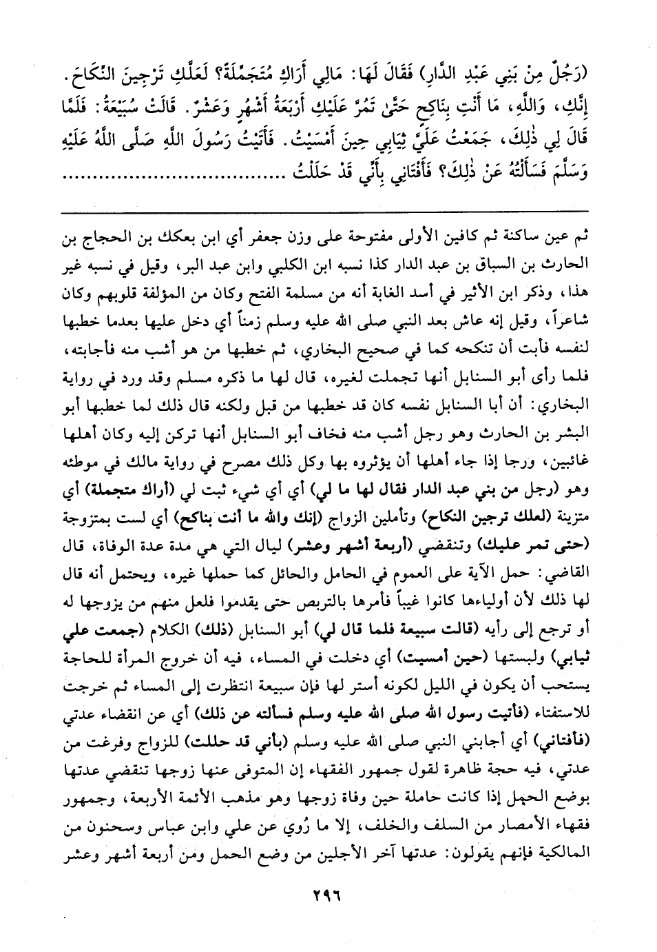 (رَجُلٌ مِنْ بَنِي عَبْدِ الدَّارِ) فَقَال لَهَا: مَا لِي أرَاكِ مُتَجَمِّلَةً؟ لَعَلَّكِ تَرْجِينَ النِّكَاحَ. إِنَّكِ، وَاللهِ، مَا أَنْتِ بِنَاكِحٍ حَتَّى تَمُرَّ عَلَيكِ أَرْبَعَةُ أَشْهُرٍ وَعَشْرٌ. قَالتْ سُبَيعَةُ: فَلَمَّا قَال لِي ذلِكَ، جَمَعْتُ عَلَيَّ ثِيَابِي حِينَ أَمْسَيتُ. فَأَتَيتُ رَسُولَ الله صَلَّى الله عَلَيهِ وَسَلَّمَ فَسَأَلْتُهُ عَنْ ذلِكَ؟ فَأَفْتَانِي بِأَنِّي قَدْ حَلَلْتُ