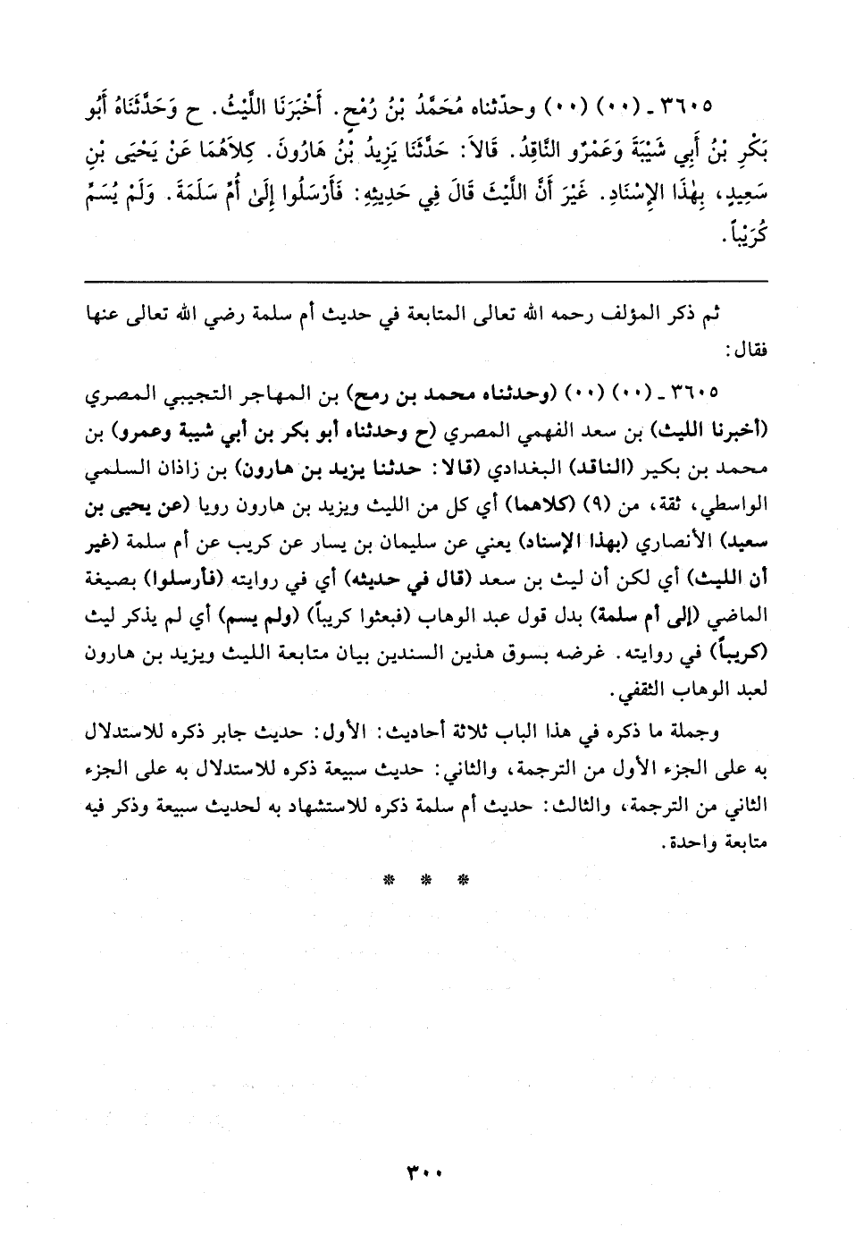 ٣٦٠٥ - (٠٠) (٠٠) وحدّثناه مُحَمَّدُ بْنُ رُفحٍ. أَخْبَرَنَا اللَّيثُ. ح وَحَدَّثَنَاهُ أَبُو بَكْرِ بْنُ أَبِي شَيبَةَ وَعَمْرٌو النَّاقِدُ. قَالا: حَدَّثَنَا يَزِيدُ بْنُ هارُونَ. كِلاهُمَا عَنْ يَحْيَى بْنِ سَعِيدٍ، بِهذَا الإِسْنَادِ. غَيرَ أَنَّ اللَّيثَ قَال فِي حَدِيثِهِ: فَأَرْسَلُوا إِلَى أُمِّ سَلَمَةَ. وَلَمْ يُسَمِّ كُرَيبًا