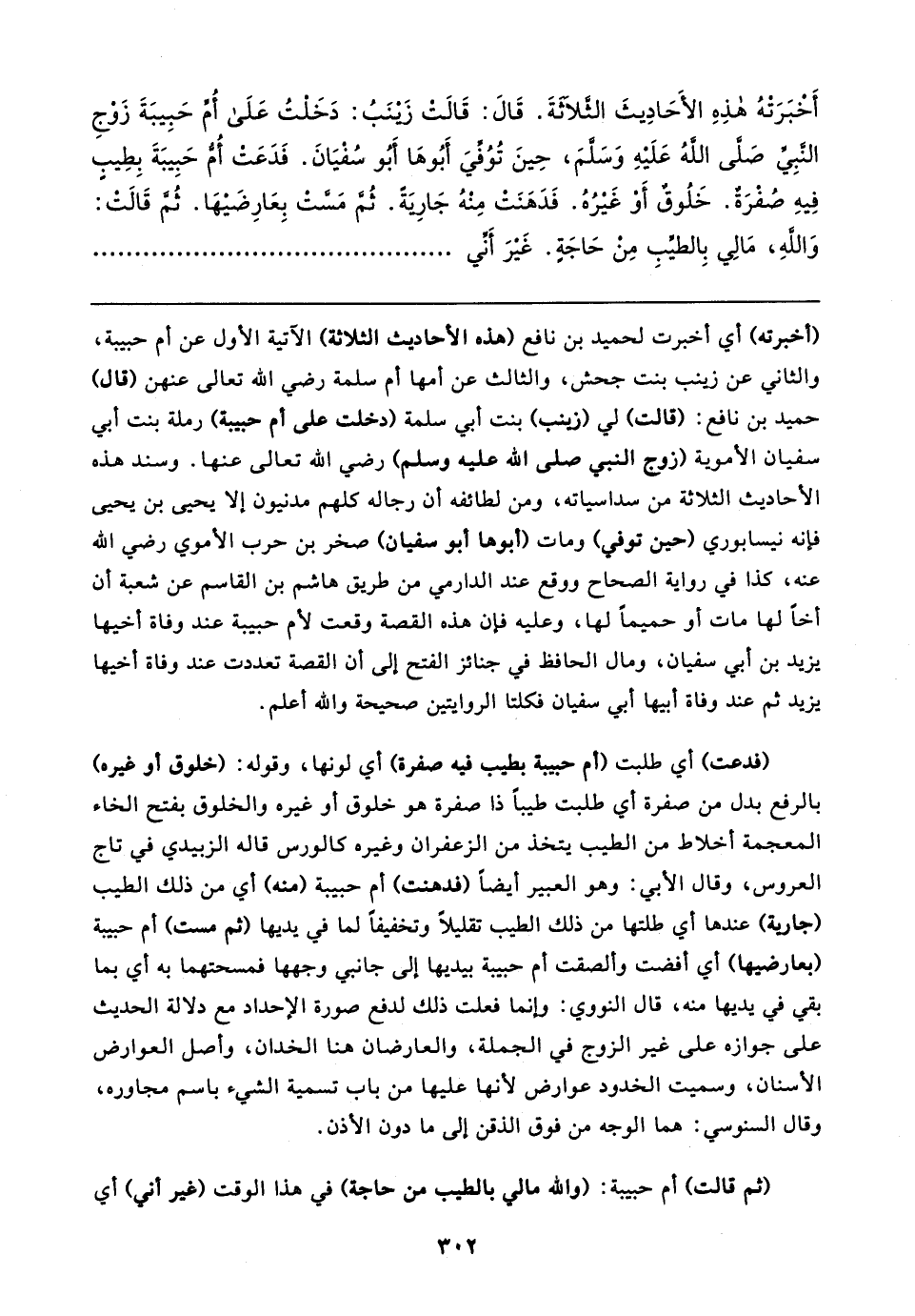 أَخْبَرَتْهُ هذِهِ الأَحَادِيثَ الثَّلاثَةَ. قَال: قَالتْ زَينَبُ: دَخَلْتُ عَلَى أُمِّ حَبِيبَةَ زَوْجِ النَّبِيِّ صَلَّى اللَّهُ عَلَيهِ وَسَلَّمَ، حِينَ تُوُفِّيَ أَبُوهَا أَبُو سُفْيَانَ. فَدَعَتْ أُمُّ حَبِيبَةَ بِطِيبٍ فِيهِ صُفْرَة. خَلُوقٌ أَوْ غَيرُهُ. فَدَهَنَتْ مِنْهُ جَارَية. ثُمَّ مَسَّتْ بِعَارِضَيهَا. ثُمَّ قَالتْ: وَاللهِ، مَا لِي بِالطيبِ مِنْ حَاجَةٍ. غَيرَ أَنِّي